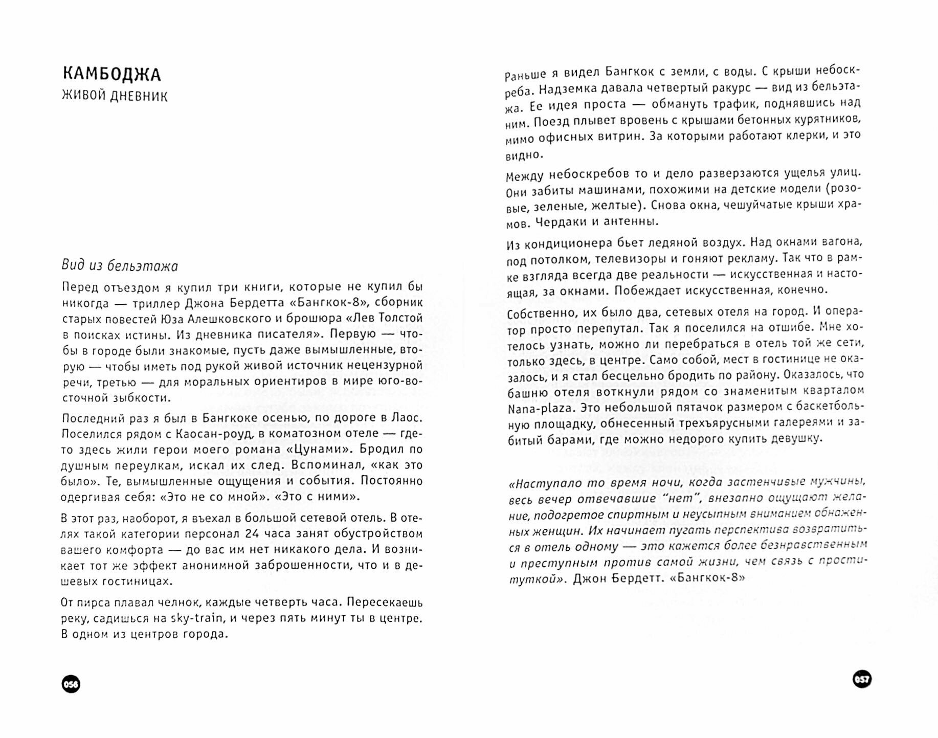 В книгу вошли тексты, написанные в разных жанрах - путевого дневника, когда записи ведутся ежедневно, и эссе, написанных после возвращения, то есть по памяти. География сборника тоже разнообразна: от Гималаев и Камбоджи до Ирана и российских провинциальных городков (Тамань, Барнаул, Ульяновск, Кемерово). Все эти города и страны объединяет авторский взгляд, направленный больше внутрь, чем вовне. Он превращает постижение "гения места" в акт самопознания, а мировидение - в мироведение. Мы изучаем другого, чтобы постичь себя, считает автор. Чтобы найти другого в себе.