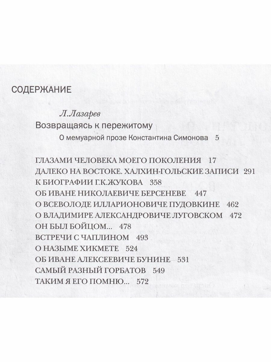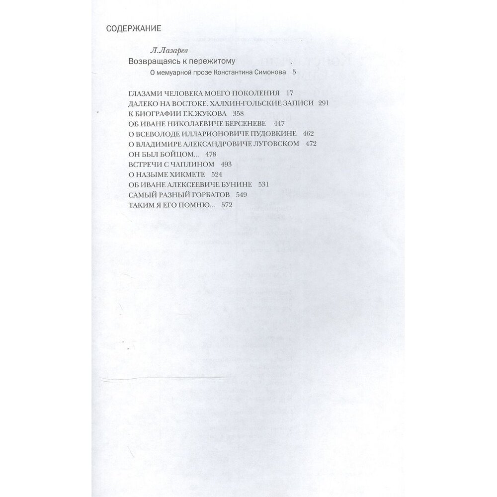 Книга воспоминаний Константина Михайловича Симонова, одного из самых известных советских писателей, автора трилогии "Живые и мертвые" и многих хрестоматийных стихотворений военной поры ("Жди меня", "Ты помнишь, Алеша, дороги Смоленщины…" и др.), наполнена размышлениями о поколении, вынесшем на своих плечах Великую Отечественную и другие войны XX столетия, о сложностях и противоречиях эпохи. В ней рассказывается о детстве, юности, становлении личности автора, о его встречах с И.В. Сталиным, Г.К. Жуковым и другими известными военачальниками, с которыми Симонов был знаком еще со времен военного конфликта на Халхин-Голе, а также с И. Буниным, Тэффи, И. Эренбургом, А. Твардовским, В. Луговским, Б. Горбатовым, Н. Хикметом, Ч. Чаплином, В. Пудовкиным и другими деятелями литературы и искусства. В книгу вошли мемуарные очерки разных лет и последняя - самая откровенная - работа писателя - "Глазами человека моего поколения".