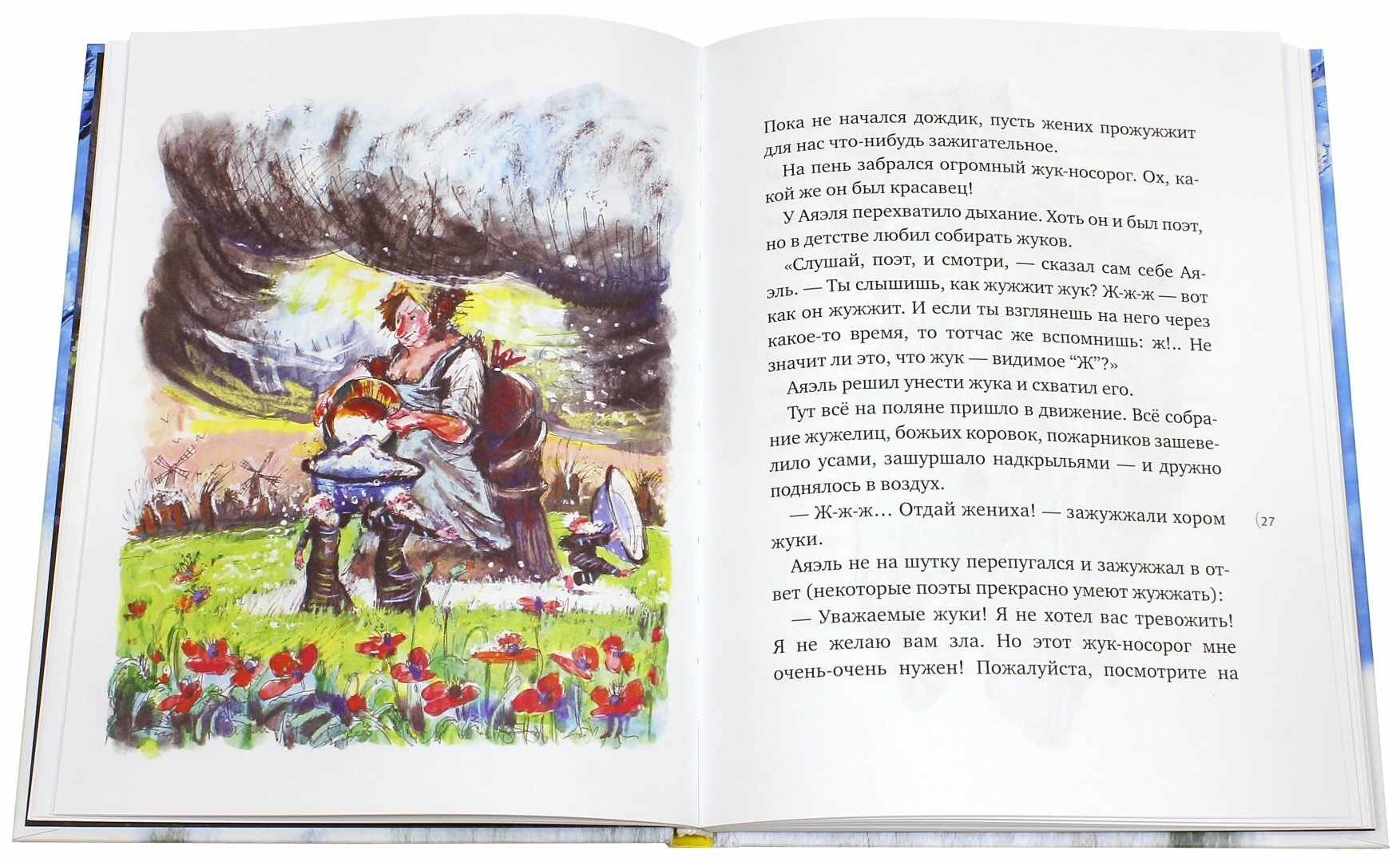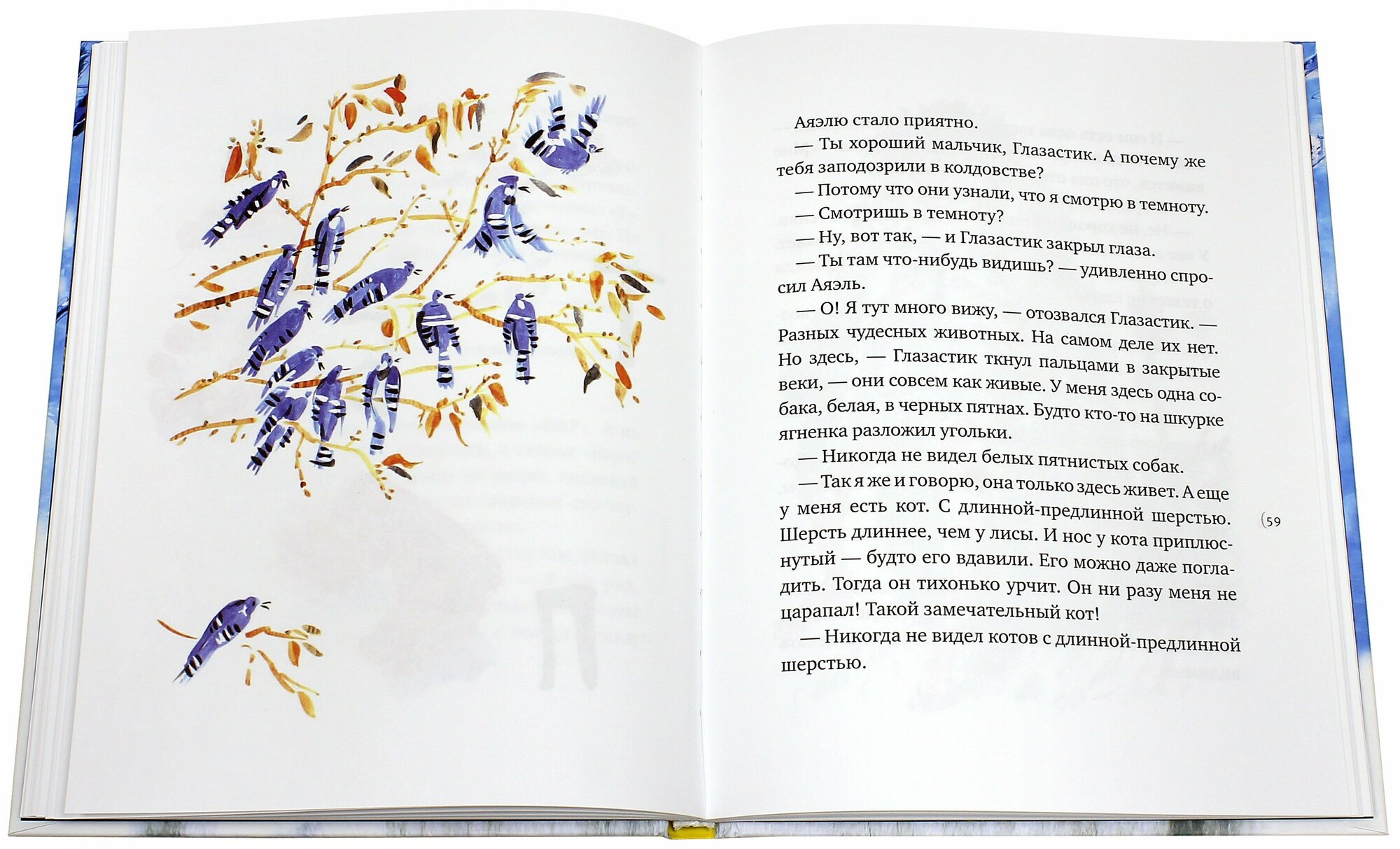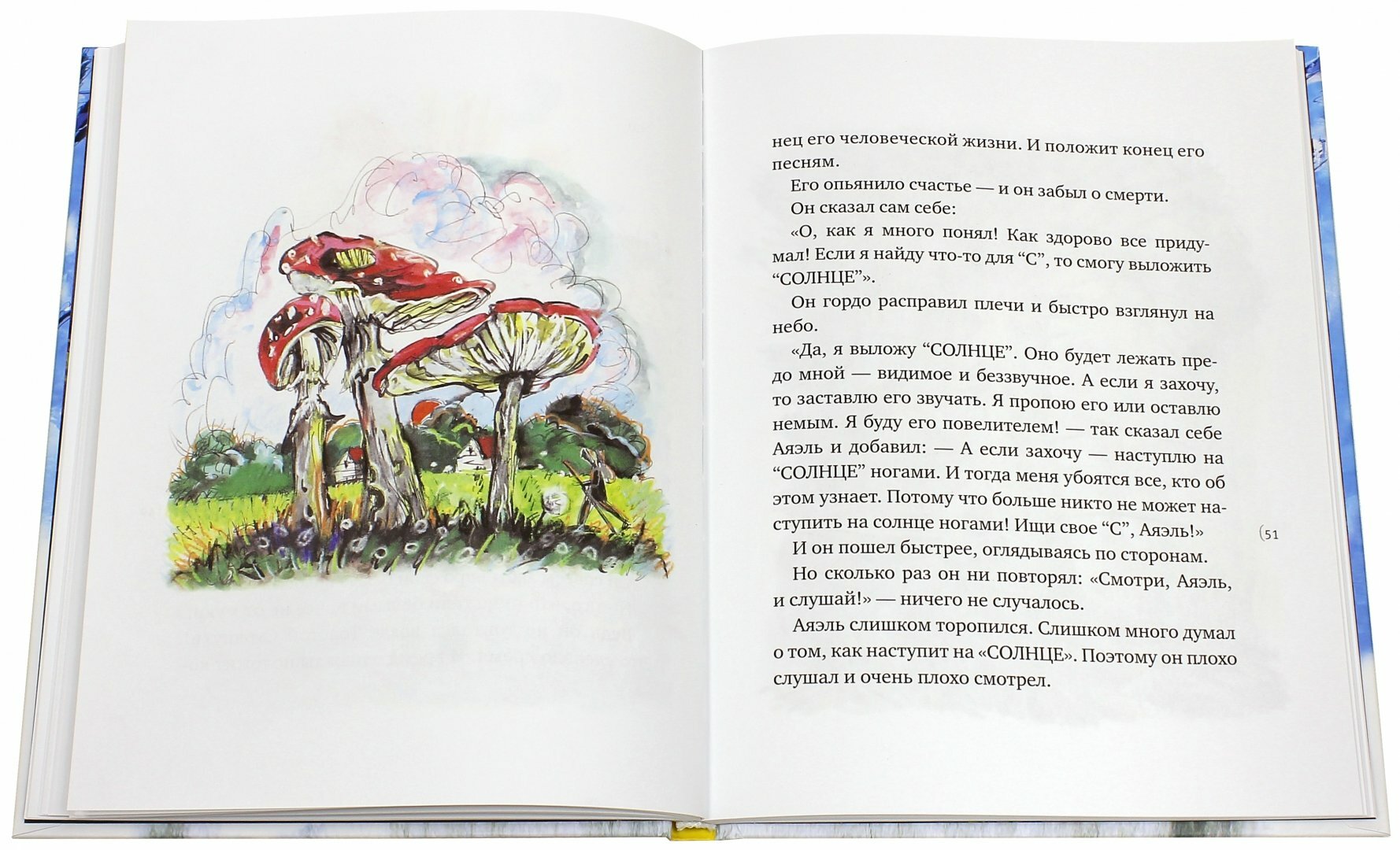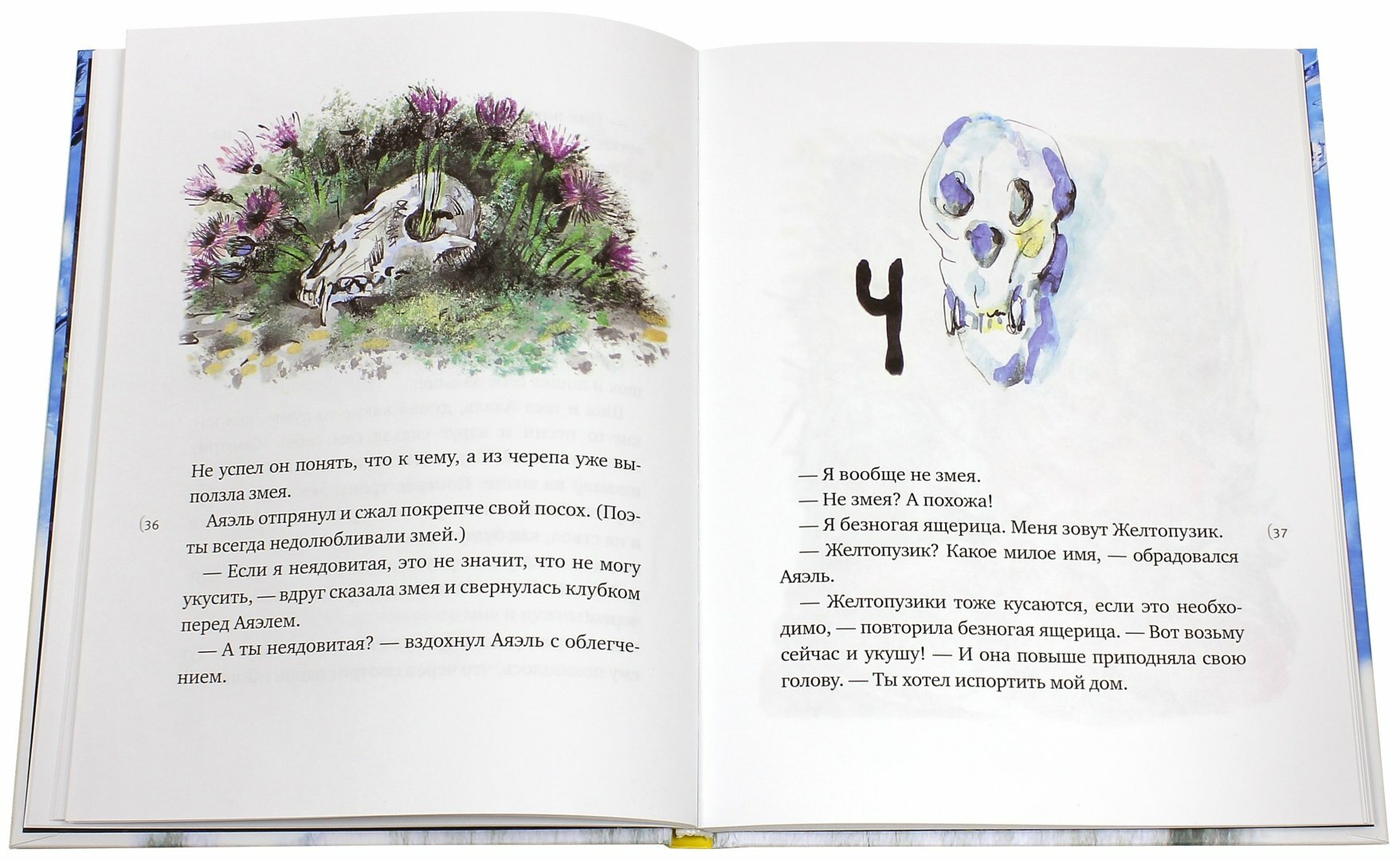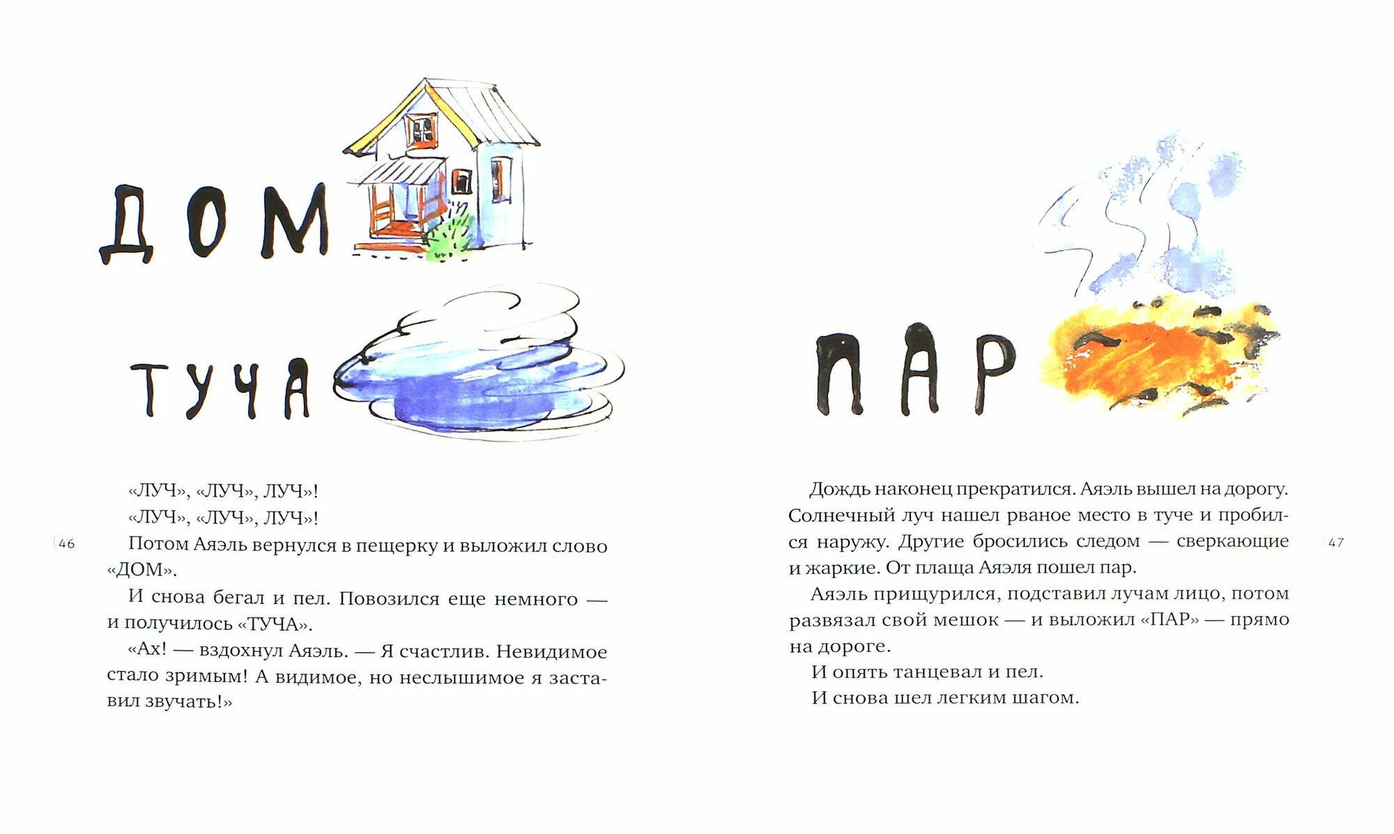 Проникновенная и поэтичная сказка о том, как поэт Аяэль искал способ сплести мир звуков и мир видимого. Мечтая о том, чтобы его песни жили долгие века, он начал изобретать способ передать - записать - их тексты. Это не история о возникновении письменности как таковой (хотя в каком-то смысле передает суть), а масштабная метафора. Аяэль мыслит образами, как истинный художник, и каждый звук для него тесно привязан к вещи (шерстинкам, попонке, синему перу). Как истинный герой эпоса, Аяэль путешествует, собирая первую азбуку (слово, которое,кстати, ему незнакомо), складывая из вещей слвоа. В истории есть и момент катарсиса - когда герой утрачивает вещи, но осознает (благодаря своему другу), что вещь не обязательна, чтобы сохранить образ. Де Соссюр сказал бы, что Аяэль создал знаковую систему со своими означаемыми и означающими.