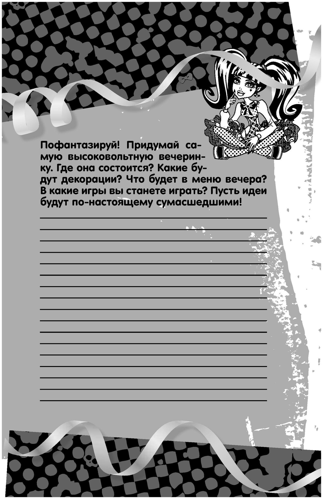 Это не книга с различными заданиями, типа лабиринтов и ребусов. В книге много информации как организовать вечеринку, подобрать аксессуары, конкурсы для гостей. Много места для заметок, что бы писать самому свои впечатления от вечеринок к различным праздникам. Если Вам нужен подарок для девочки от 10 лет, которая знает и увлекается "Школой монстров" , то это самое то. Девочкам младше 10 лет , по моему, будет не интересно.