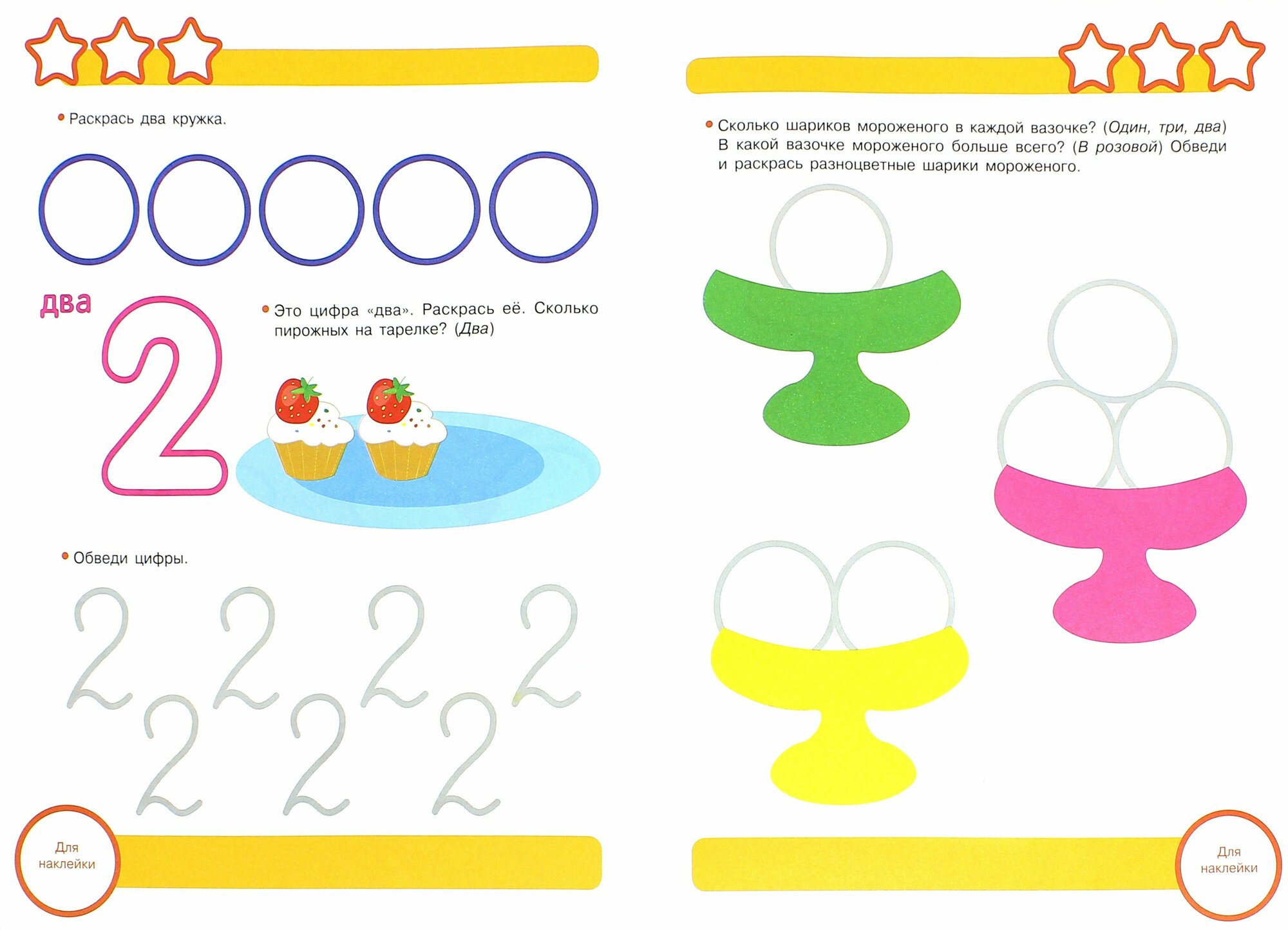 В этом пособии несколько страниц посвящены понятиям одно/много. Сначала немного расстроилась, для 4х лет это совсем уж просто. Дальше задания на счет от 1 до 5. Почти на каждой странице надо что-то раскрасить, обвести, сосчитать, дорисовать. Есть поощрительные наклейки.