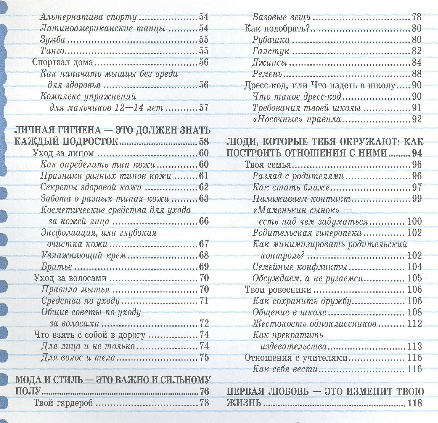 Книга замечательная. Текст изложен легко и непринужденно. Из данного издания можно многое почерпнуть. Эта книга поможет мальчишка разобраться в себе и даст правильный совет. Всем рекомендую у кого подрастают мужчины:-)