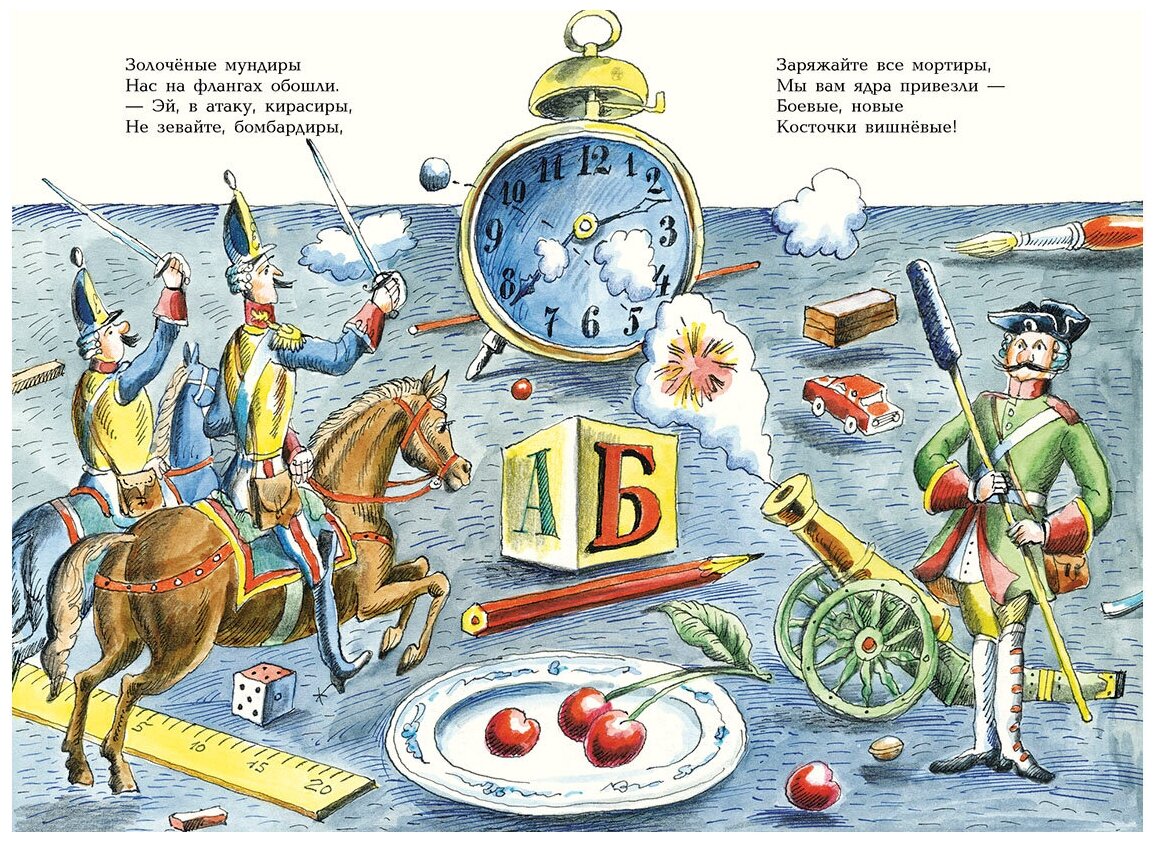 Книга приятная, размер небольшой, удобно читать. Иллюстрации оригинальными показались и приятными...но: в стихотворении много сложных слов "кирасиры", "мортиры", "грамматика" ну и пока "Чапай")