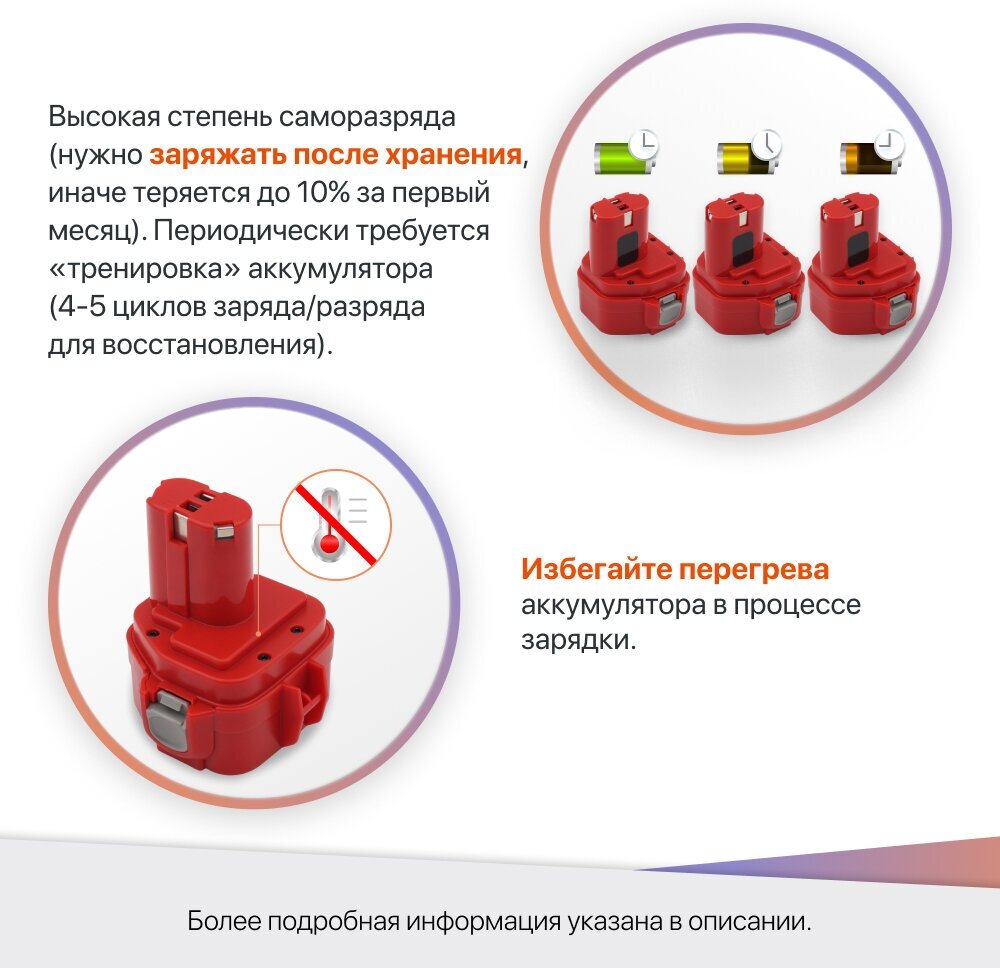 Makita 192597-4 Makita 1222 - компактный Ni-Cd аккумуляторный блок для дрелей и шуруповертов кубической формы с двумя защелками для быстрой и надежной фиксации в рукоятке инструмента. Не греется при зарядке большими токами, а при правильной эксплуатации обладает длительным сроком службы, достигающим 2000 циклов зарядки. Имеет эффект памяти, а поэтому заряжать стоит только полностью разряженную батарею.
