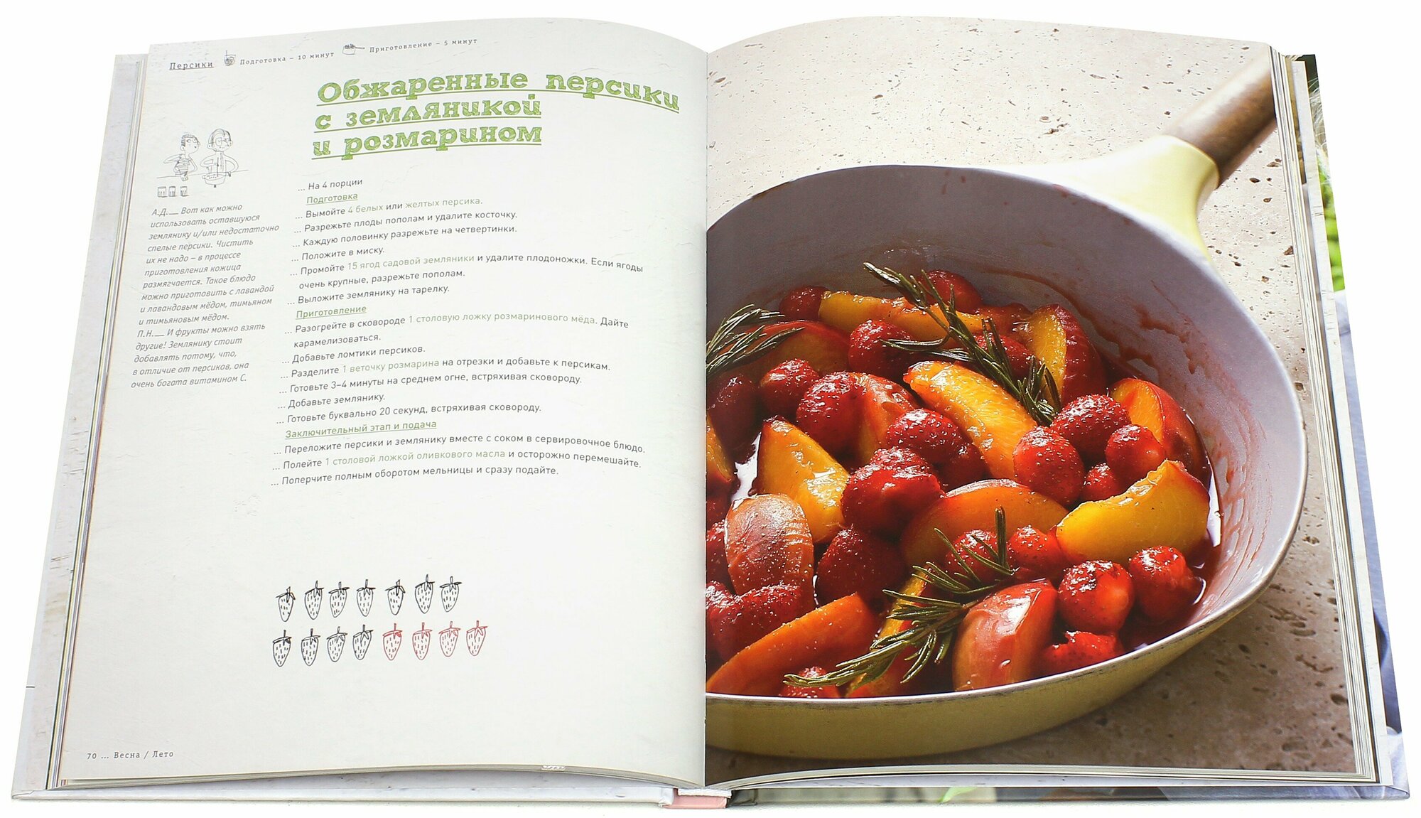 Помимо чисто гастрономических целей, авторы книги ставили задачей предложить лакомства полезные и низкокалорийные, основу которых составляют обычные сезонные фрукты и ягоды. И даже овощи! Как выяснилось, чудесный десерт можно приготовить, например, из помидоров. Здесь вы найдете земляничное или абрикосовое мороженое-сорбе и шашлычки-брошеты из летних фруктов, фруктовый салат с лавандовым мёдом и блинчики-рожки с красными ягодами, жареные ананасы и эскимо из кокосового ореха, карпаччо из персиков и спагетти с малиной, песочное печенье с инжиром и гренки "бедный рыцарь" с яблоками и виноградом. За уровнем сахара, содержанием полезных веществ, минералов и витаминов бдительно следит диетолог Поль Нейра. Так что можно будет не корить себя за невоздержанность и не сокрушаться о лишних килограммах. И не нужно часами стоять у плиты - все десерты готовятся довольно быстро и понятны большинству новичков.