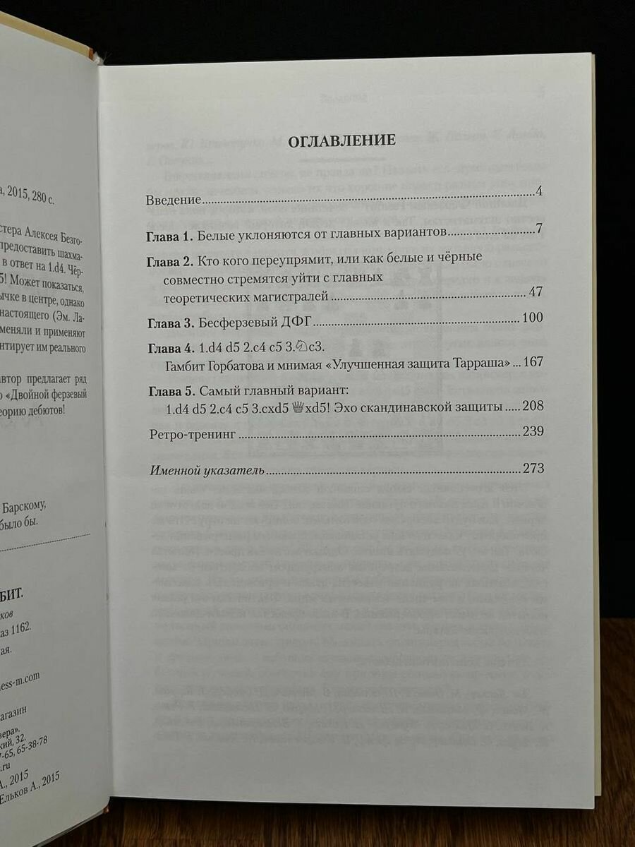 Книга известного теоретика и тренера гроссмейстера Алексея Безголова «Двойной Ферзевый Гамбит» - это попытка предоставить шахматисту любого уровня полный дебютный репертуар в ответ на l.d4. Чёрные играют l...d5 и на 2.с4 или 2.®f3 отвечают 2...с5! Может показаться, что черные недостаточно готовы к немедленной стычке в центре, однако многие выдающиеся гроссмейстеры прошлого и настоящего (Эм. Ласкер, М. Эйве, П. Свидлер...) весьма успешно применяли и применяют эту схему. Даже глубокая подготовка белых не гарантирует им реального преимущества.