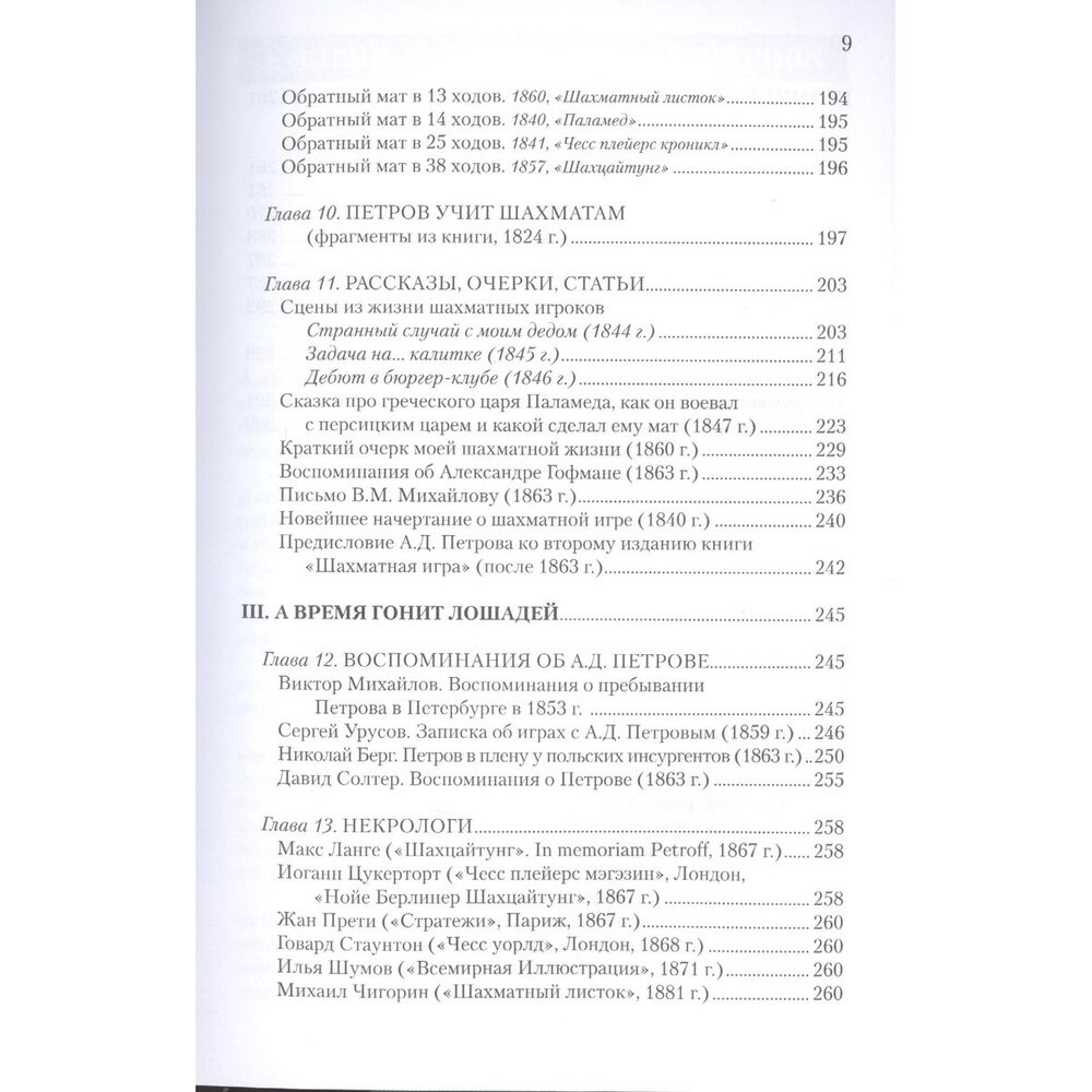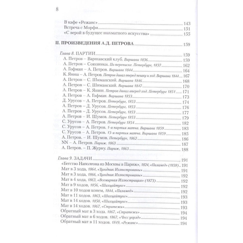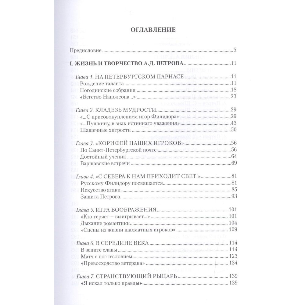 Главная книга о нашем легендарном маэстро - по всем серьёзным подсчётам рейтинга с и л ь н е й ш е м шахматисте Европы 1-ой половины XIX века, авторе как минимум трёх партий-шедевров (абсолютный рекорд эпохи) и 1-го русского шахматного учебника, крупном составителе задач, создателе изящных, полных доброго юмора литературных рассказов на шахматную тему... Петров продемонстрировал уникальное творческое долголетие, отличался редким комбинационным дарованием, выдающейся игрой в эндшпиле, незаурядным для своего времени позиционным пониманием.