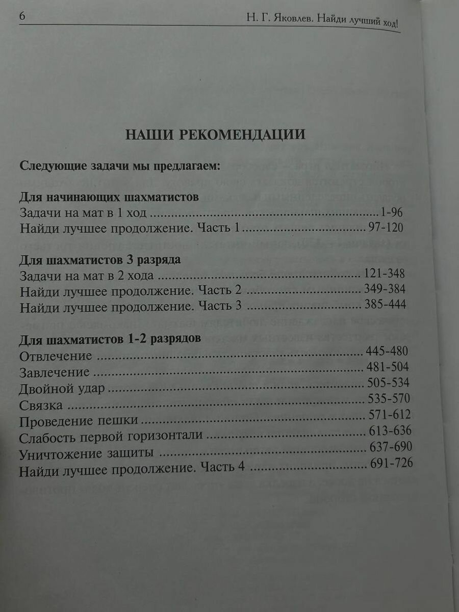 Книга "Шахматы.Найди лучший ход!" Яковлева Николая Георгиевича представляет из себя сборник шахматных задач для начинающих шахматистов, для уровня 4-3-2 и 1-ого разряда. Решать задачи - полезное дело. Выигрыш партии за счет тактики является чуть ли не 100% исходом партии для шахматистов до 1-ого разряда. Поэтому, смело решайте задачки и развивайте свое тактическое шахматное мышление.