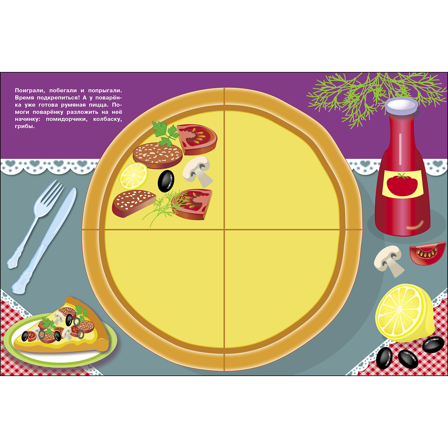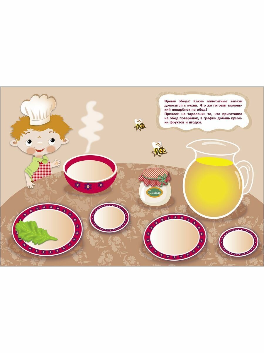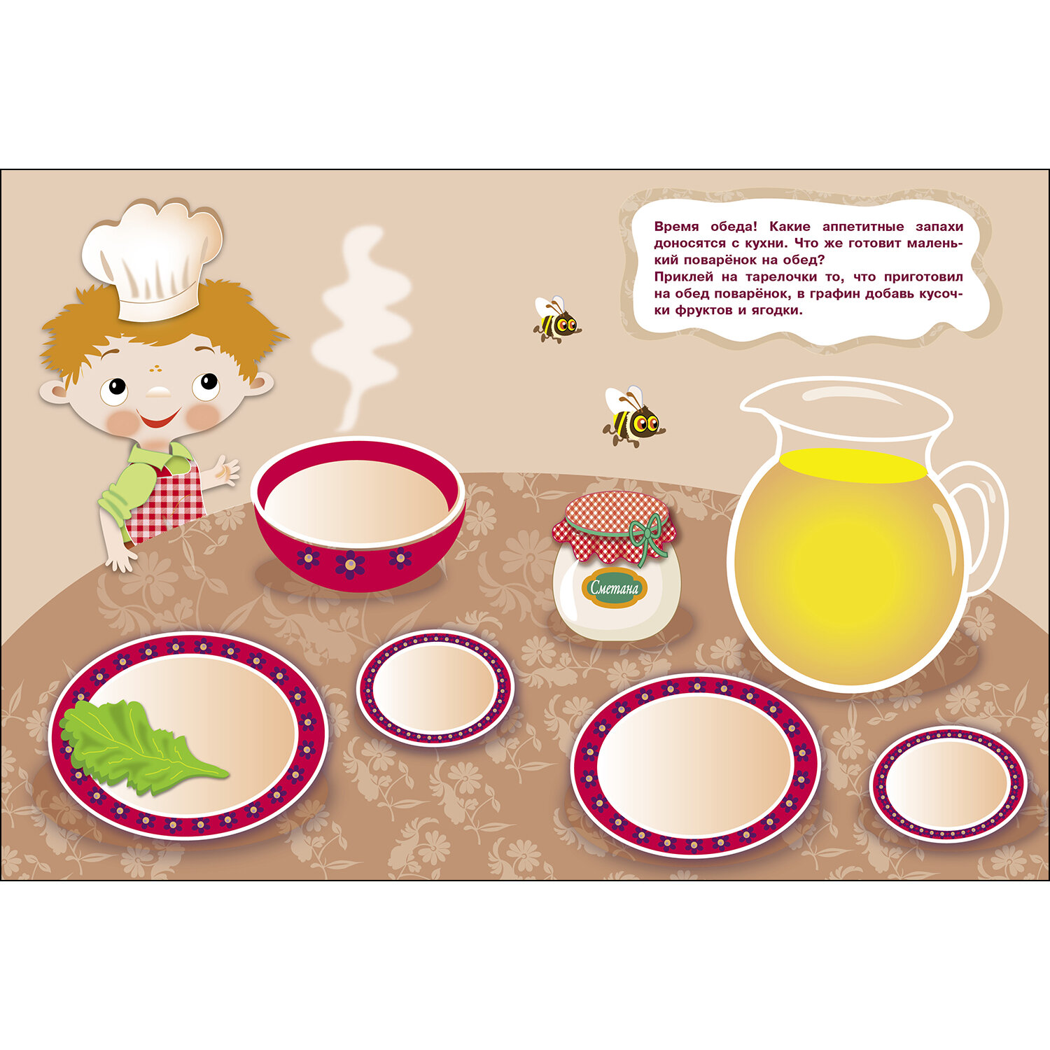 Формат А4, яркие иллюстрации, не менее яркие наклейки, что привлекает внимание ребенка на все 100%. Немного страничек, но, благодаря тому, что наклейки многоразовые (они расположены на прозрачной основе), можно вновь и вновь творить, клеить и переклеивать по несколько раз!!! На каждом развороте задание - разместить наклейки по своим местам! Что касается Поваренка, то здесь нужно, например, положить колбаску и помидорчик на хлеб для бутерброда, сделать начинку для пиццы и так далее!!! Конечно такие задания ребенок выполняет с моей помощью, но когда она в «свободном плавании» наклеечки клеятся туда куда ОНА считает правильным!!! Мне приятно наблюдать как дочка с усердием работает пальчиками переставляя наклейки и с очень умным видом))). Когда мы вместе занимаемся, всегда проговариваем название всех продуктов, можем их пересчитать, в общем с пользой проводим время!!!