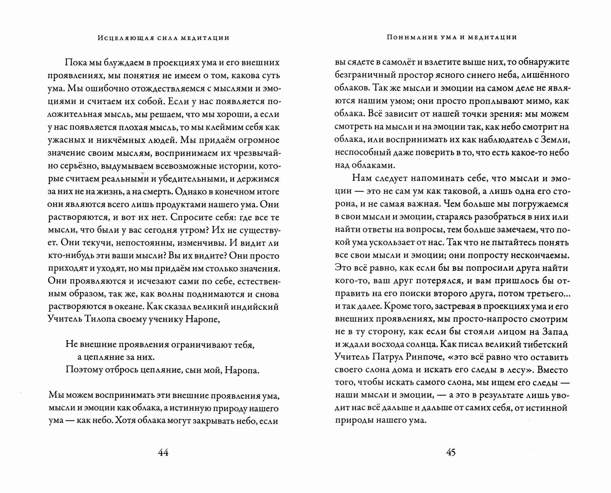 Регулярная практика медитации оказывает мощное воздействие на тело и ум, меняя структуру мозга и неся с собой всевозможные положительные эффекты: удовлетворённость и благополучие, психическую устойчивость и сосредоточенность, более крепкое душевное и физическое здоровье, большие эмпатию и сострадание. Этот разнородный по содержанию сборник объединяет голоса современных учителей тибетского буддизма и ведущих мировых учёных и специалистов по здоровью, которые предлагают читателю завораживающий взгляд на ум и эмоции, новые исследования и рассказы "из первых уст" о том, как медитация с успехом применяется сегодня в области медицины и в социальной сфере. .- Согьял Ринпоче и Джецун Кхандро Ринпоче рассказывают о том, как медитация раскрывает целительную силу ума. .- Джон Кабат-Зинн рассматривает преимущества использования осознанности в официальном здравоохранении. .- Клиффорд Сарон пишет о Проекте Шаматха, самом всеохватном исследовании воздействия медитации из проведённых на данный момент. .- Сара Лазар повествует о том, что происходит с нашим мозгом во время медитации. .- Эрика Розенберг описывает, как медитация помогает устанавливать более полный контакт со своими эмоциями. .- Люцио Биццини пишет о том, как когнитивно-поведенческая терапия на базе осознанности используется для лечения депрессии. .- Урсула Бейтс рассказывает о том, как практика осознанности помогает неизлечимо больным пациентам на заключительных этапах их жизни. .Кроме того, в книгу входят главы, написанные новаторами - исследователями и врачами, применяющими медитацию в сфере здравоохранения и в социальной работе: это Розамунд Оливер и доктора медицины Эдел Маэкс, Кэти Бланк и Фредерик Розенфельд. .