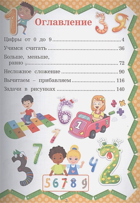 Книга яркая, картинок много. Толстая. Обложка мягкий тонкий картон. Вначале изучение цифр 0-10, как они пишутся по клеточкам ребенок тренируется. Потом: найди цифру, раскрась по цифрам и др. на закрепление цифр. Счет предметов. Примеры на слож-ние и выч-ние в пределах 10. Изучение цифр до 20. Потом примеры в картинках, примеры в цифра, задачи текстом. От простого к сложному. Задания разнообразнейшие.