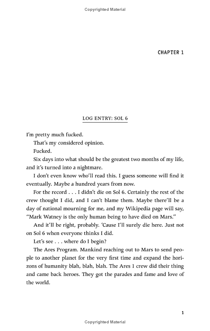 I'm stranded on Mars. I have no way to communicate with Earth. I'm in a habitat designed to last 31 days. If the oxygenator breaks down, I'll suffocate. If the water reclaimer breaks down, I'll die of thirst. If the hab breaches, I'll just kind of explode. If none of those things happen, I'll eventually run out of food and starve to death. So yeah. I'm screwed.