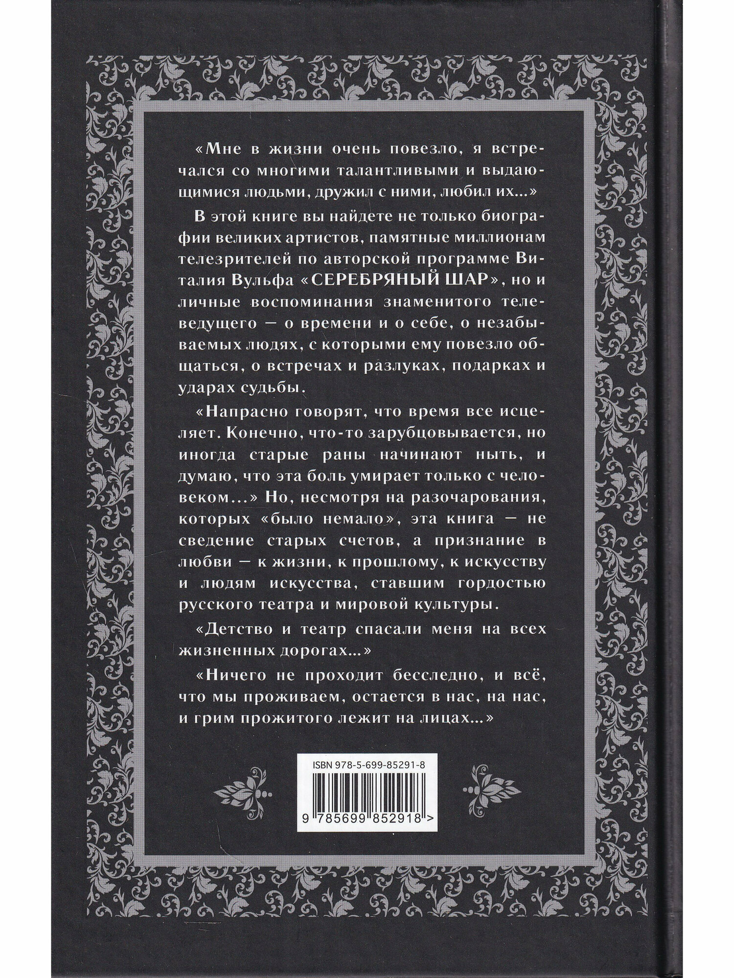 "Мне в жизни очень повезло, я встречался со многими талантливыми и выдающимися людьми, дружил с ними, любил их…" В этой книге вы найдете не только биографии великих артистов, памятные миллионам телезрителей по авторской программе Виталия Вульфа "Серебряный шар", но и личные воспоминания знаменитого телеведущего - о времени и о себе, о незабываемых людях, с которыми ему повезло общаться, о встречах и разлуках, подарках и ударах судьбы. "Напрасно говорят, что время всё исцеляет. Конечно, что-то зарубцовывается, но иногда старые раны начинают ныть, и думаю, что эта боль умирает только с человеком..." Но, несмотря на разочарования, которых "было немало", эта книга - не сведение старых счетов, а признание в любви - к жизни, к прошлому, к искусству и людям искусства, ставшим гордостью русского театра и мировой культуры. "Детство и театр спасали меня на всех жизненных дорогах…" "Ничего не проходит бесследно, и всё, что мы проживаем, остается в нас, на нас, и грим прожитого лежит на лицах…"