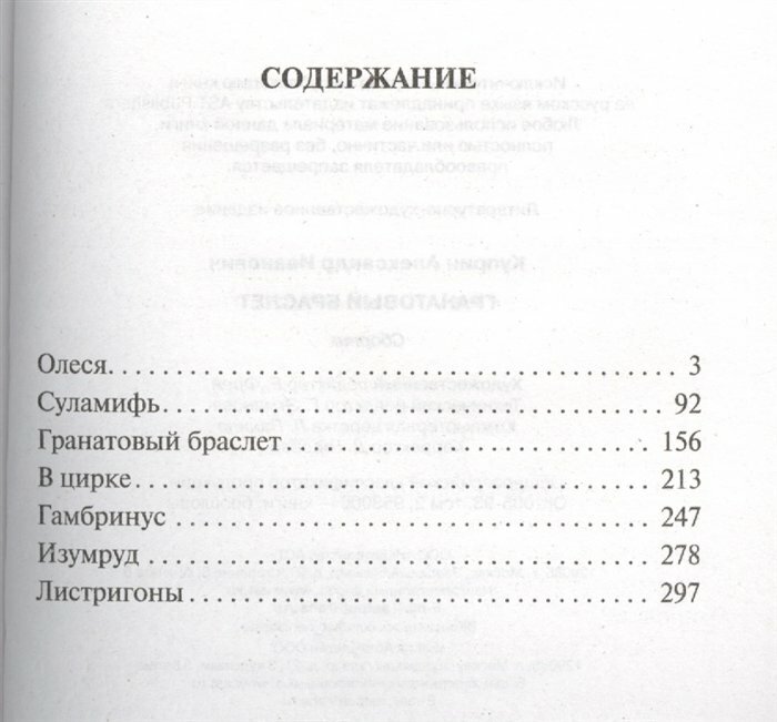 Завораживающая, трагическая фантазия "Суламифь", рассказывающая о прекрасной и чистой любви царя Соломона и девушки Суламифь. "Гранатовый браслет" - печальная повесть о безвозвратно потерянной любви, развеянной по ветру мелодией сонаты Бетховена. И, наконец, "Олеся" - история любви барского сына и живущей в лесу девушки-колдуньи Олеси, которой не суждено было завершиться счастливым концом - то ли темные силы, то ли предрассудки, то ли просто судьба разлучили влюбленных навсегда.