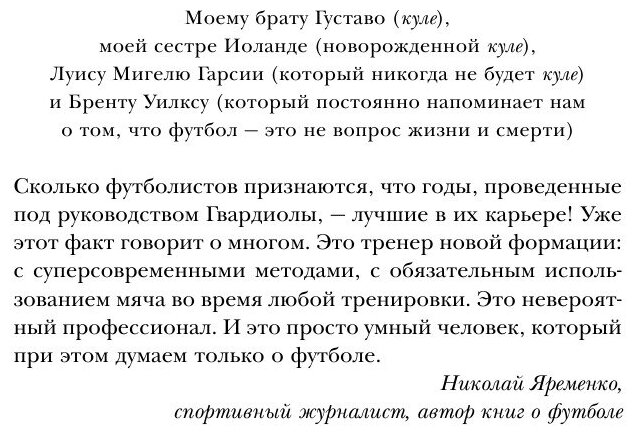 Пеп Гвардиола На пике. Гильем Балаге. Книгу покупала мужу. он не то чтобы фанат, но когда есть время. всегда футбол смотрит и в теме разбирается. Книга ему понравилась очень, он два дня увлеченно читал и пытался со мной обсудить. Потом нашел другое ухо - стал папе рассказывать, он тоже в теме, и теперь и книгу эта у него, он читает. В общем, хорошая книга оказалась, не зря ее купила.