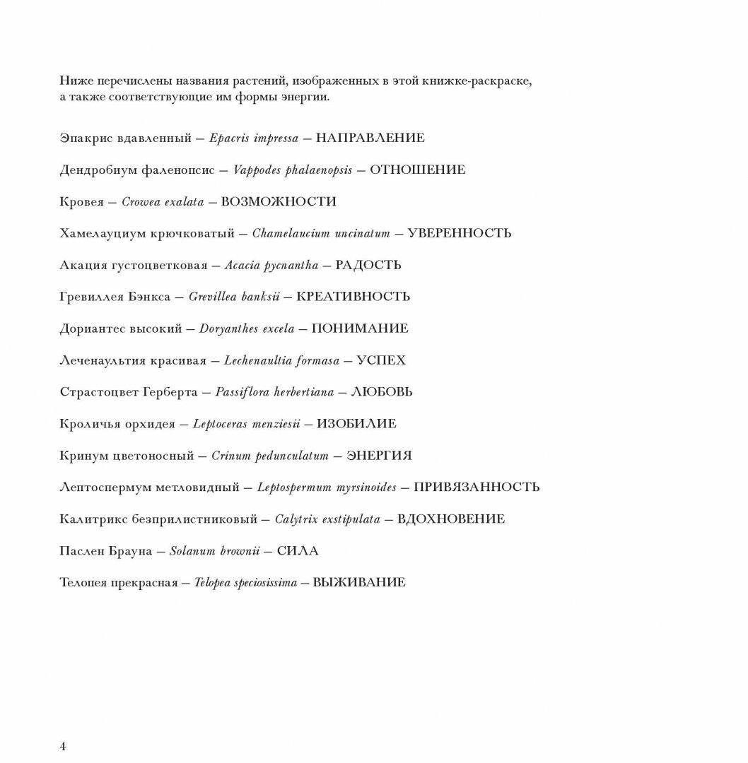 В этом альбоме вы найдете рисунки, созданные специально для того, чтобы наполнить вас вдохновляющей и исцеляющей энергией цветов. Геометрический калейдоскоп представленных здесь орнаментов заряжен красотой и творческой энергией природы. В их основе - удивительные растения, которые можно встретить в разных уголках Австралии: в пустынях, тропических лесах, на равнинах, в горах и на побережье. Раскрашивайте эти волшебные узоры фломастерами, карандашами, красками - чем угодно, лишь бы это успокаивало ваш ум и вдохновляло сердце.