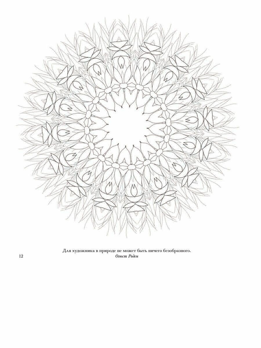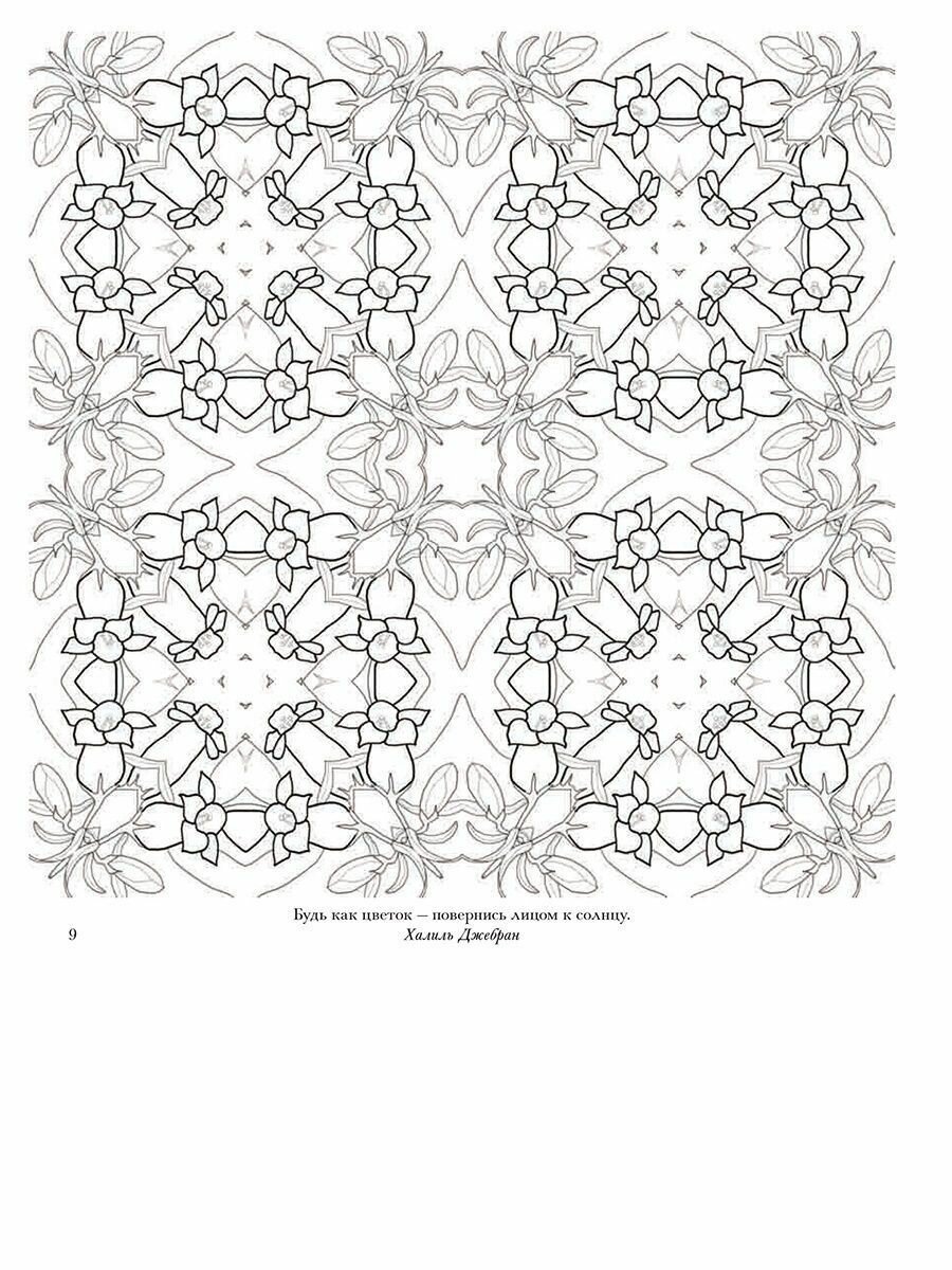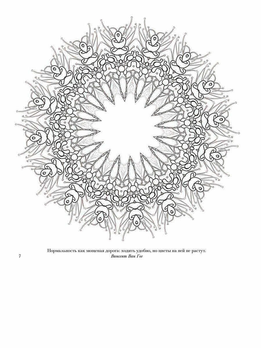 Красивая раскраска, детализированные рисунки похожие на цветочные калейдоскопы. Довольно мелкие элементы рисунка потребуют кропотливой работы с погружением в процесс. Лучше взять ручки или фломастеры.