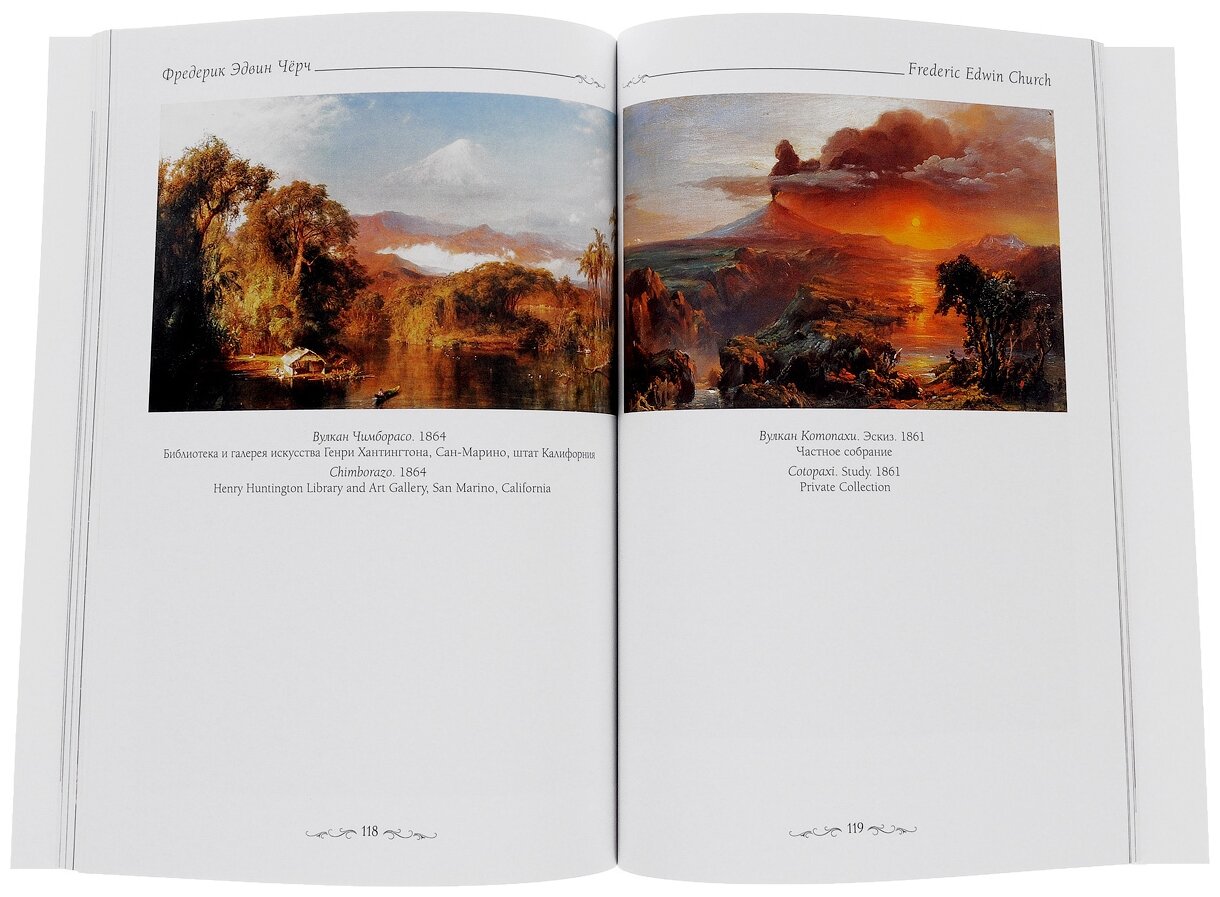 Богато иллюстрированный альбом познакомит вас с жизнью и творчеством американского художника XIХ века, представителя «Школы реки Гудзон», Фредерика Эдвина Чёрча. Известный американский художник Фредерик Эдвин Чёрч родился в городе Хартфорде, штат Коннектикут. Его отец был серьезным предпринимателем и хотел, чтобы сын стал его помощником и наследником семейного дела. Однако младший Чёрч был художником от Бога, и его жизнь пошла по иному направлению. Учителем Чёрча был знаменитый пейзажист, один из основателей «Школы реки Гудзона» Томас Коул. С 1845 году живописец ежегодно выставляет свои работы в Национальной академии рисунка в НьюЙорке. Чёрч писал полотна на религиозные и литературные сюжеты, портреты, но основным призванием для него был пейзаж. Художник любил путешествия и, помимо знакомства со многими землями родной страны, побывал в Южной Америке, многих странах Европы и на Ближнем Востоке. Чёрч стремился представить уникальные античные сооружения, необычные пейзажи и явления природы — величественные горные системы и водопады, айсберги, плавающие на просторах морей, вулканы и даже их извержения. Умер живописец, пропагандист экзотической природы, в одном из самых урбанизированных городов мира, тогда и ныне, — Нью-Йорке.