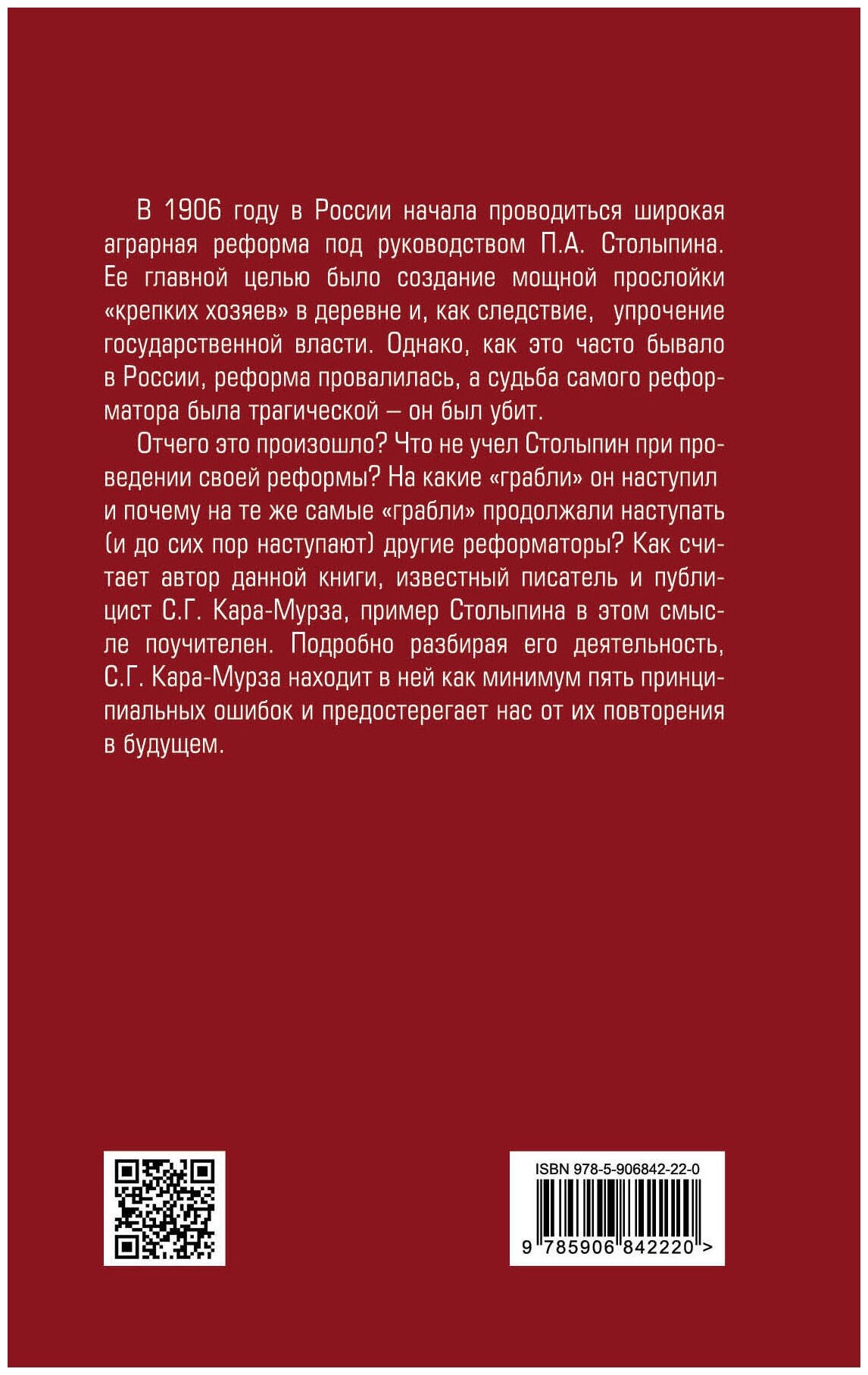 Отчего это произошло? Что не учел Столыпин при проведении своей реформы? На какие "грабли" он наступил, и почему на те же самые "грабли" продолжали наступать (и до сих пор наступают) другие реформаторы? Как считает автор данной книги, известный писатель и публицист С.Г. Кара-Мурза, пример Столыпина в этом смысле поучителен. Подробно разбирая его деятельность, С.Г. Кара-Мурза находит в ней как минимум пять принципиальных ошибок и предостерегает от возможных ошибок в будущем.
