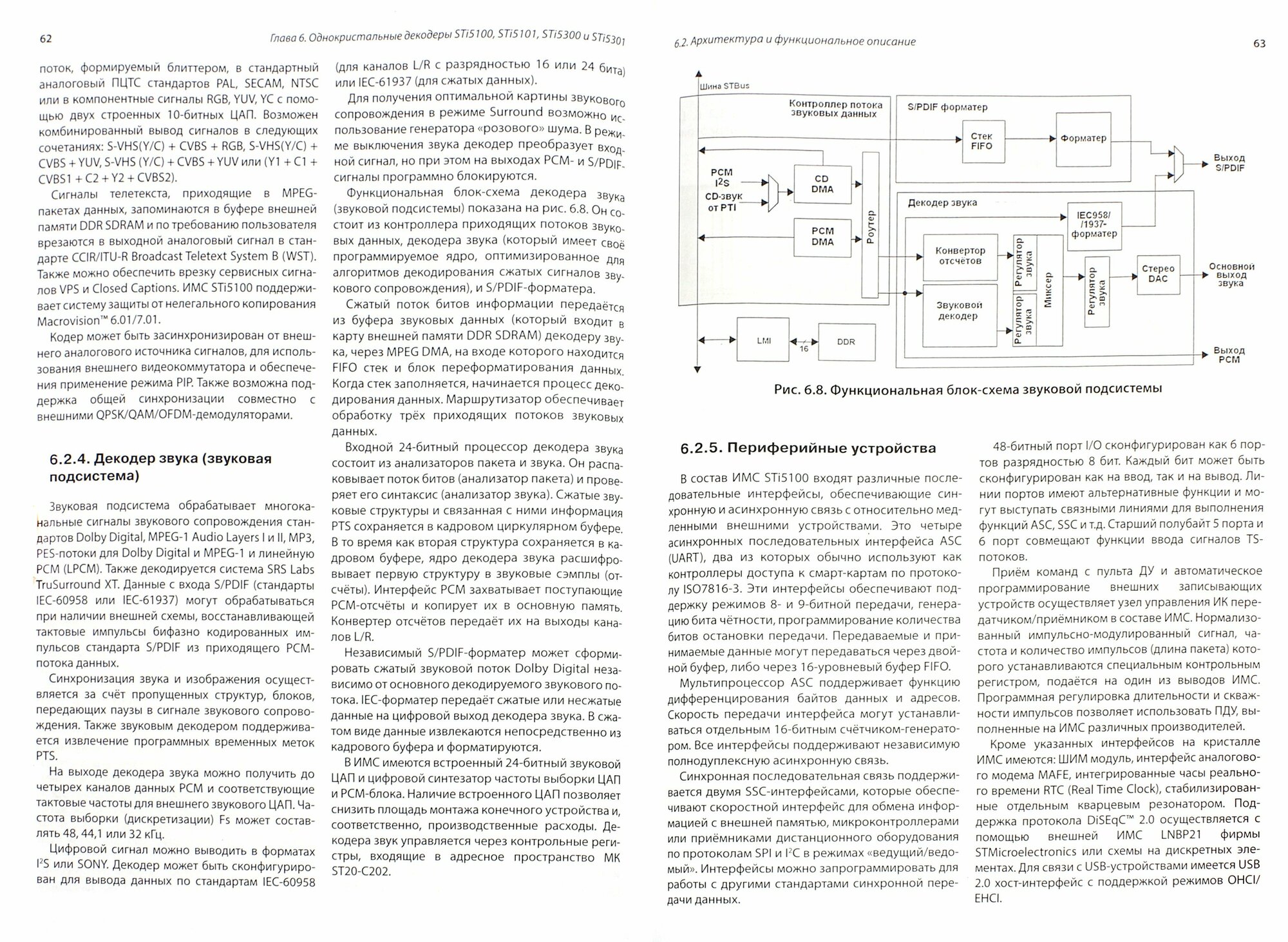 Книга представляет собой справочное пособие по однокристальным декодерам фирмы STMicroelectronics, предназначенным для приёмников-приставок (ресиверов), абонентских терминалов, ТВ приёмников сигналов цифрового телевидения. В книгу вошли материалы практически по всем декодерам фирмы, выполненным на основе технологии "Система на Кристалле" (СнК), начиная с первых интегральных схем, применяемых для приёма сигналов стандартной чёткости, и заканчивая семейством LIEGE для приёма ТВ высокой чёткости. Помимо функционального устройства однокристальных декодеров даны пространственное расположение и назначение их выводов, а также характерные неисправности, связанные с выходом их из строя этих ИМС, и методы диагностики дефектов.