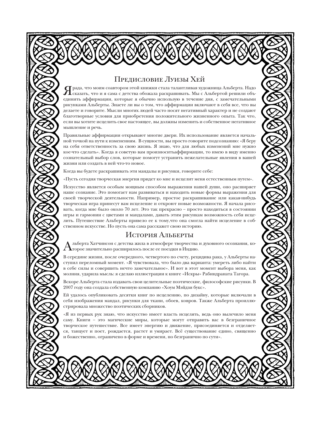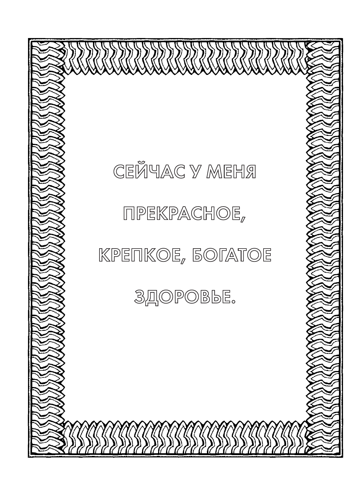 Перед вами альбом для раскрашивания от автора мировых бестселлеров о женском счастье - Луизы Хей. Здесь вы найдете подборку целительных аффирмаций, сопровождаемых черно-белыми рисунками Альберты Хатчинсон. Художница получила широкую известность благодаря тому, что ее изобразительные творения помогли справиться с тяжелым диагнозом не только ей, но и многим другим людям. "Это так прекрасно - просто находиться в состоянии игры и гармонии с цветами и мандалами, просто давая возможность этим рисункам себя исцелить", - говорит Луиза Хей, приглашая нас насладиться увлекательным процессом раскрашивания.
