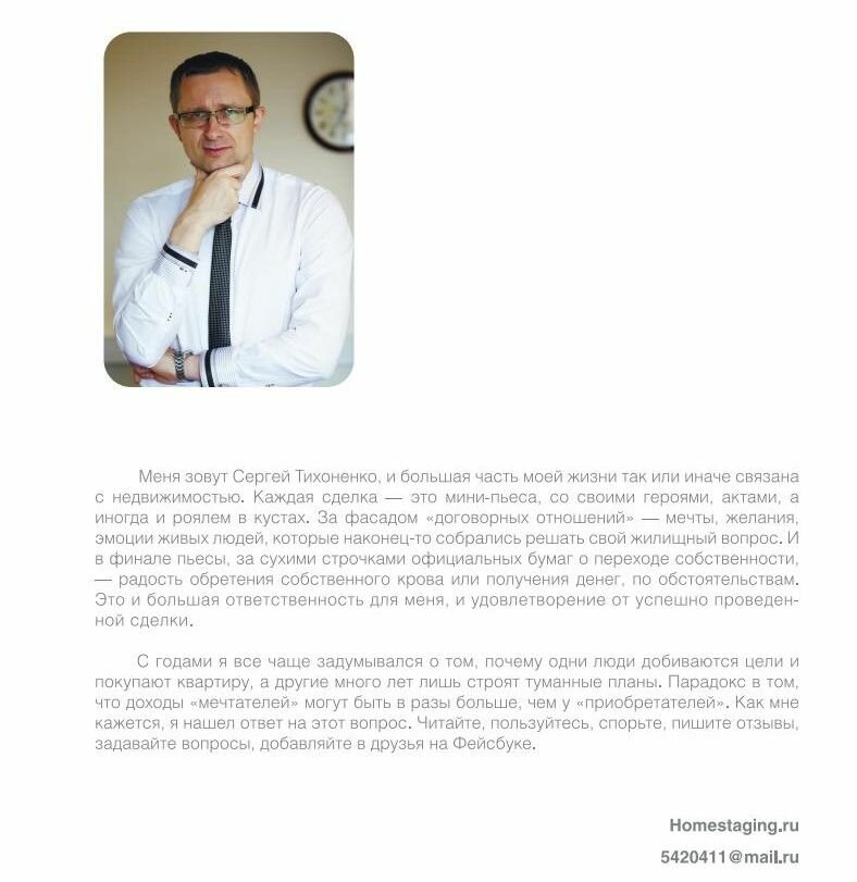 Далее выражаю огромную благодарность автору Сергею Тихоненко за интересную, остроумную, мотивирующую книгу! Автор очень просто, оптимистично, но настойчиво уверяет: "Каждый может купить квартиру! Не надо бояться, что у меня не получится."