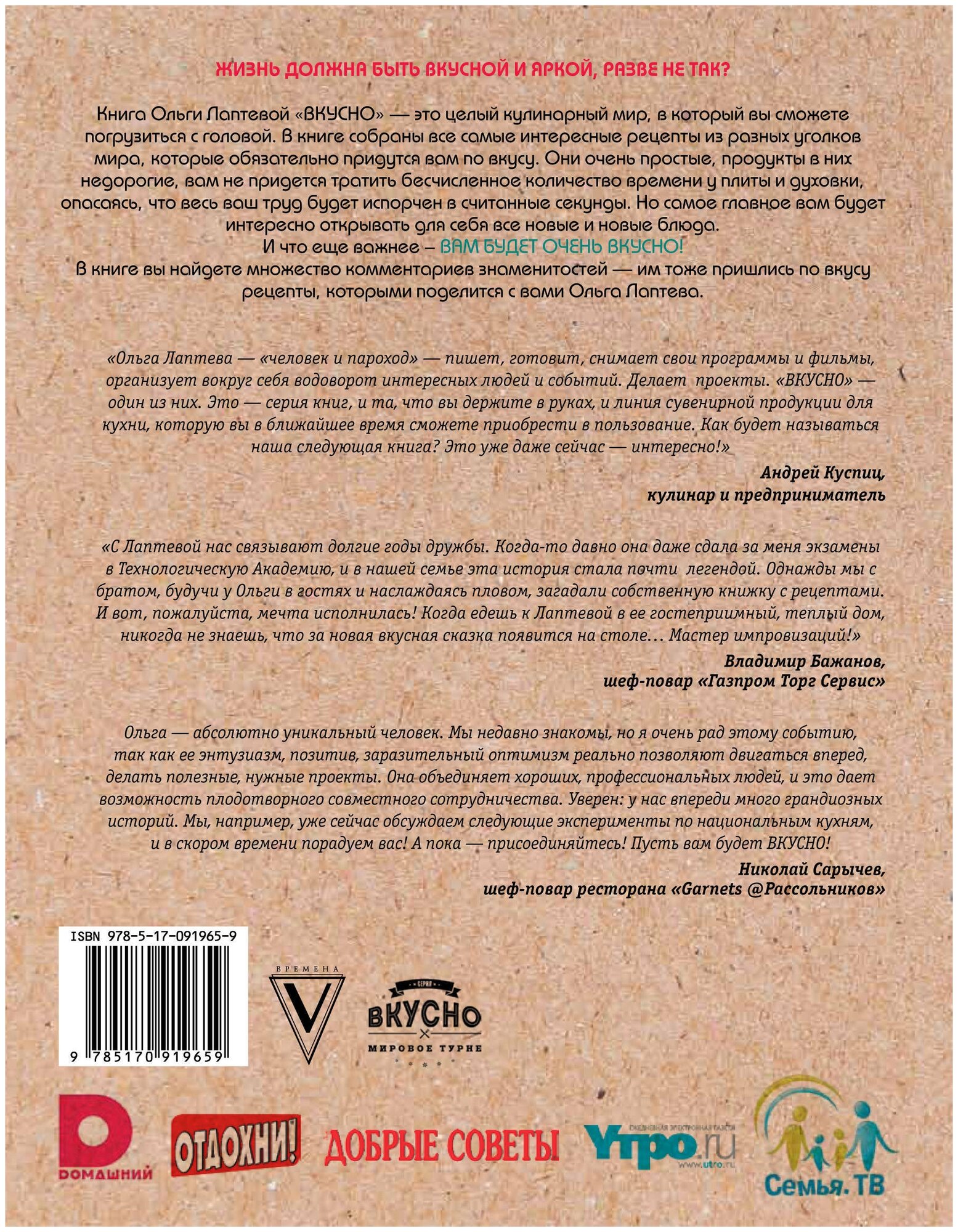 "Ольга Лаптева - "человек и пароход" - пишет, готовит, снимает свои программы и фильмы, организует вокруг себя водоворот интересных людей и событий. Делает проекты. "ВКУСНО" - один из них. Это - серия книг, и та, что вы держите в руках, и линия сувенирной продукции для кухни, которую вы в ближайшее время сможете приобрести в пользование. Как будет называться наша следующая книга? Это уже даже сейчас - интересно!"
