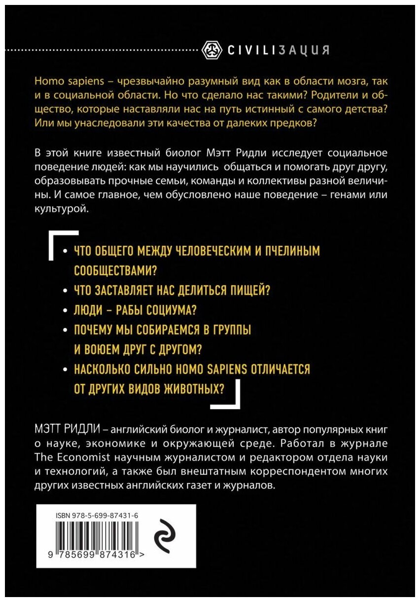 Что мы знаем о социальном поведении человека? Мы работаем в командах, образуем крупные или маленькие коллективы, строим семьи и собираем вокруг себя круг друзей. Добродетель и взаимопомощь - плоды, данные нам нашей культурой. Или все-таки нет?.. Книга известного ученого и журналиста Мэтта Ридли помогает человеку "взглянуть со стороны на наш биологический вид со всеми его слабостями и недостатками". Подобно Ричарду Докинзу, Ридли пишет о сложных и научных вопросах легко и занимательно. Гены и культура, инстинкты и нормы поведения - все они стоят на страже целостности человеческого общества, и помогают нам, людям, оставаться людьми.