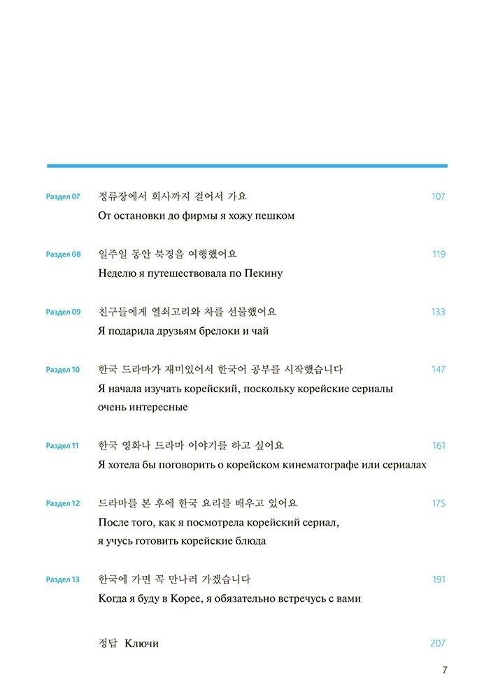 В учебнике разобраны разные темы, например, раздел 12 "После того, как я посмотрела корейский сериал, я учусь готовить корейские блюда". Всего разделов 13. Книга не скучная!!!! Много упражнений, диалогов, а также переводы к диалогам