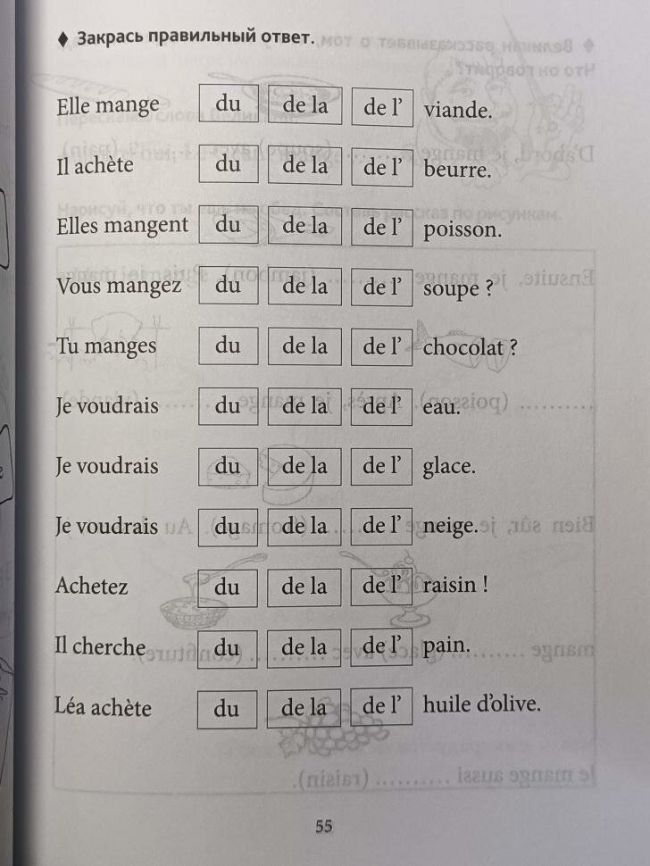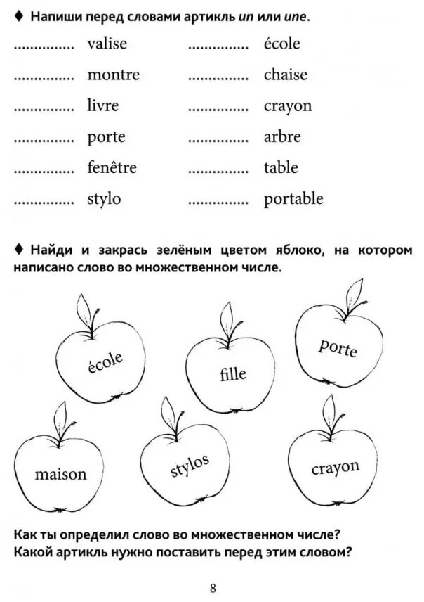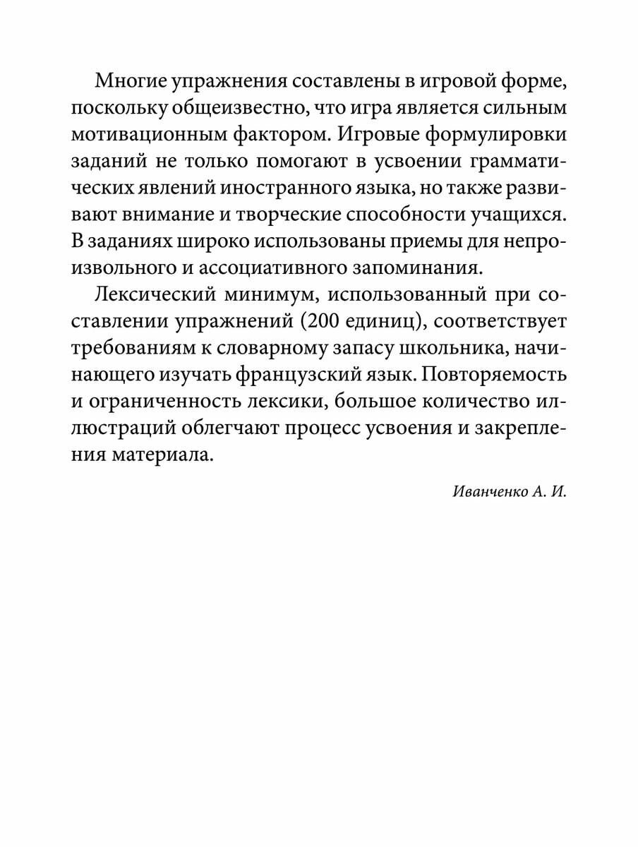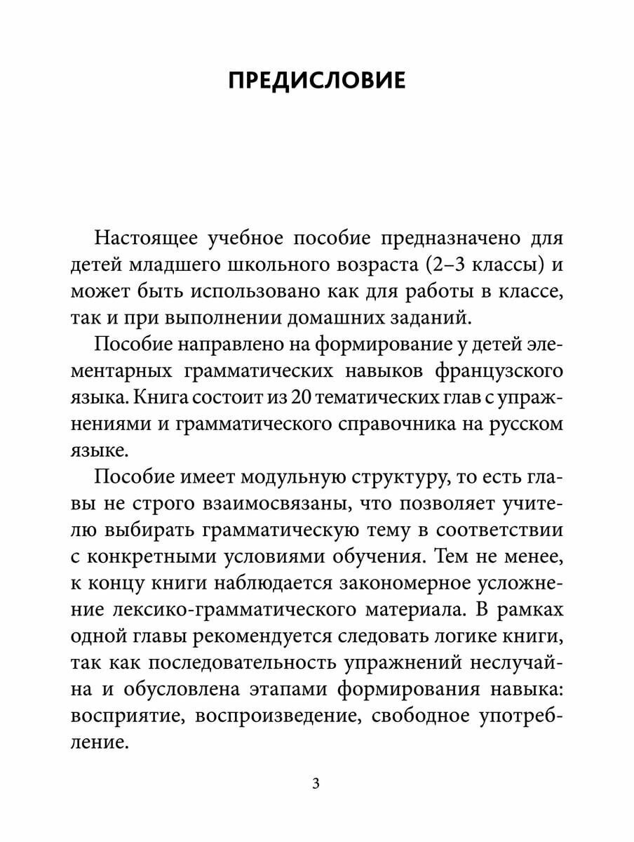 Купили эту книгу в качестве дополнения для самостоятельного изучения франц.языка для детей дома.Данное пособие полностью подходит для начинающих изучать французский язык школьников младших классов. Грамматика представлена на понятном и доступном языке именно для детей.Много интересных заданий,с иллюстрациями,многие упражнения повторяются для постепенного закрепления материала .Все задания абсолютно несложные ,если изначально понять основное правило грамматики по теме.Где-то надо выбрать правильный ответ из предложенных вариантов,где-то соединить картинку и слово,в некоторых заданиях необходимо самому составить целые предложения.В конце книги есть грамматический справочник, в помощь родителям,и соответственно ребятам,где кратко описаны основные правила грамматики,которые рассматриваются в упражнениях в этом пособии.В целом книга хорошая для изучения языка в непринужденной игровой форме.
