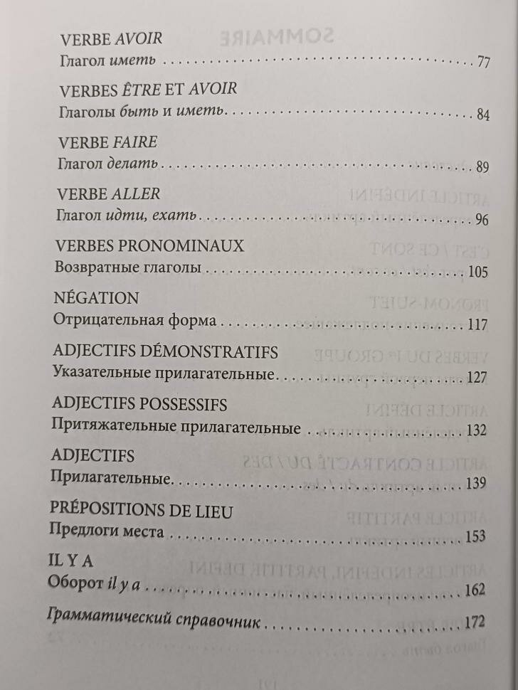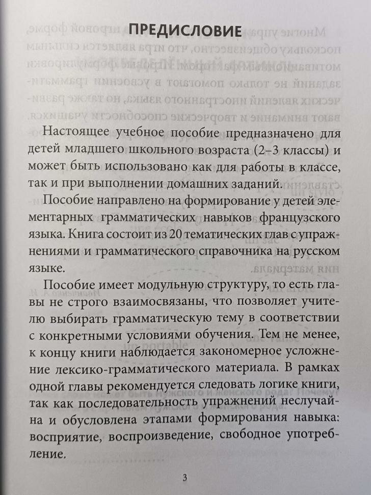 Пишу отзыв первый раз и по запросу, приобрели грамматику для самостоятельных занятий французским языком к дополнению к занятиям с учителем. Учебное пособие мне лично понравилось, хотя я не знаток французского языка, книга состоит из 20 глав с упражнениями, многие составлены в игровой форме, детям интересно, приемы с ассоциативным запоминанием работают на ура. Будет полезна для тех кто уже начал изучать французский язык. Немного тонковаты листы прозрачность повышена, но мне это абсолютно не мешает в восприятии материала.Также с конце книги имеется грамматический справочник на 20 страниц на русском языке.