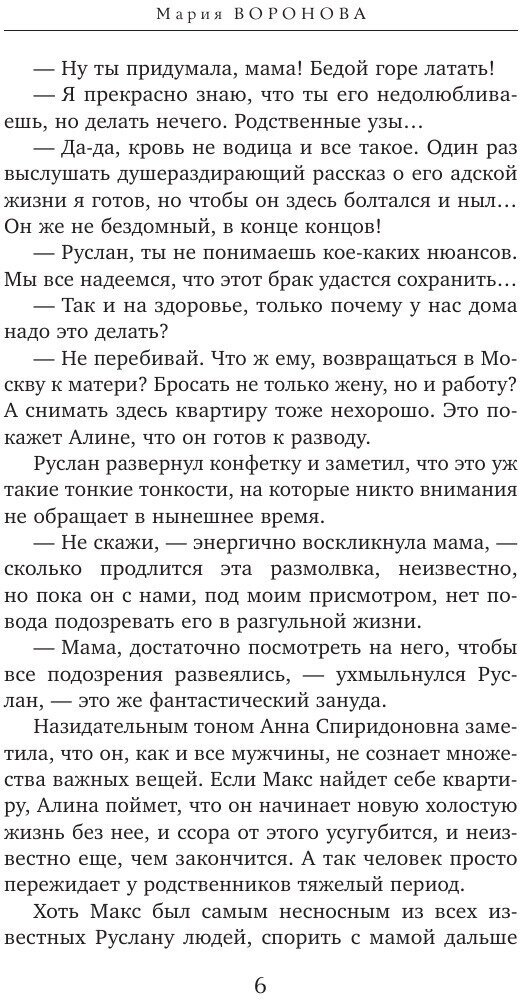 Я читаю все романы Марии Вороновой. Мне нравится, что ее герои переходят из одного романа в другой (был главный герой - стал одним из окружения, а читателю приятно вновь встретиться с ним). Все герои Вороновой так или иначе связаны с миром медицины. Нам, немедикам, интересно и поучительно взглянуть на жизнь глазами медиков. Моя взрослая дочь тоже с удовольствием читает книги Марии Вороновой.