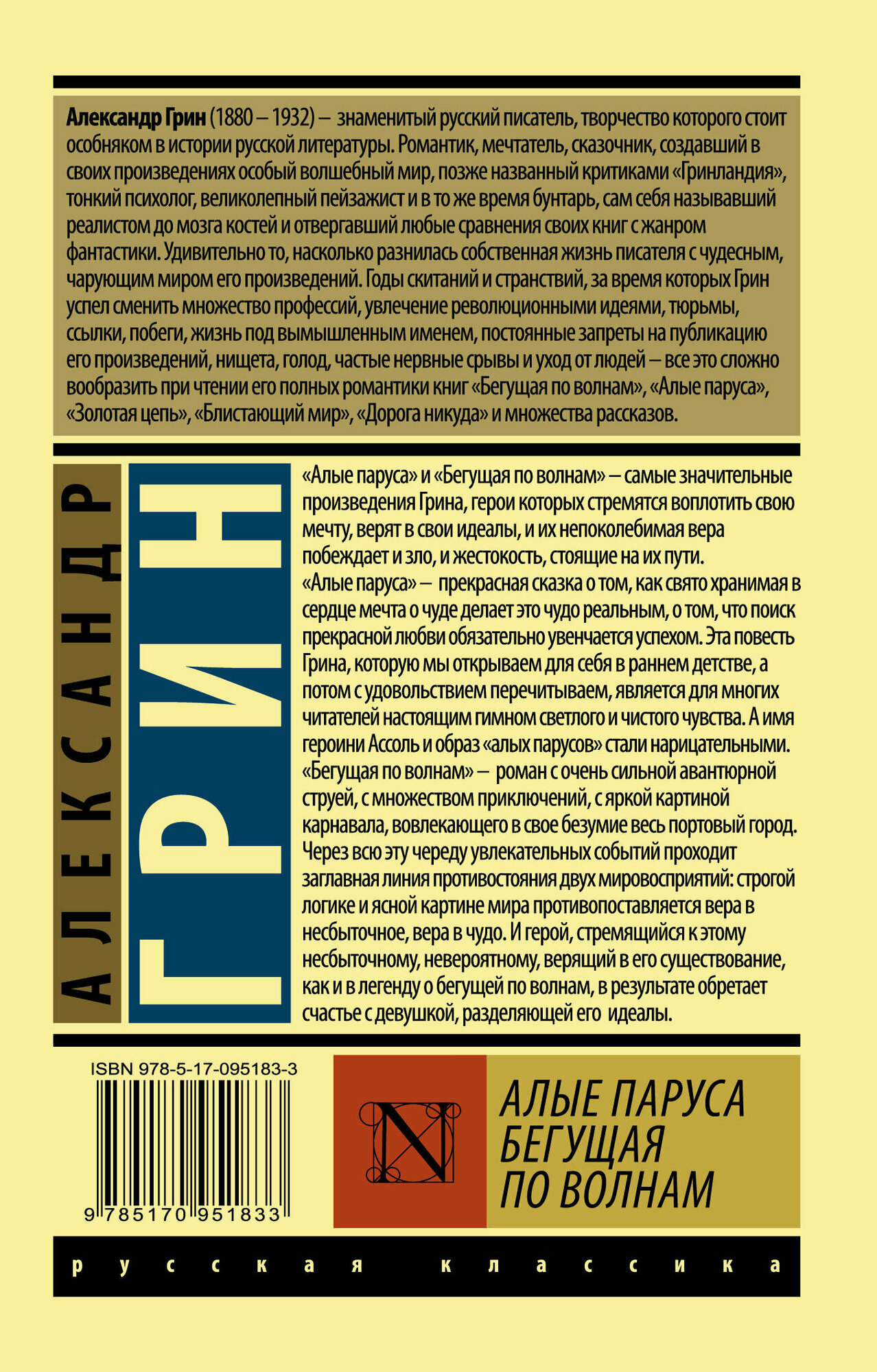 Обожаю "Алые паруса" с детства - и фильм, и книгу!!! Заказала именно эту книгу потому что: цена некусачая, обложка и вся серия Экслюзив: Русская классика супер, шрифт приемлемый, бумага хоть и газетная, но не пачкается и приятная на ощупь. А роман "Бегущая по волнам" давно хотела прочитать, и они как раз оказались вместе в одной книге. Александр Грин еще раз подтверждает свое направление - романтик, сказочник с особым волшебным миром. Отбросьте все заботы на время, окунитесь в эти две истории любви и получите наслаждение......