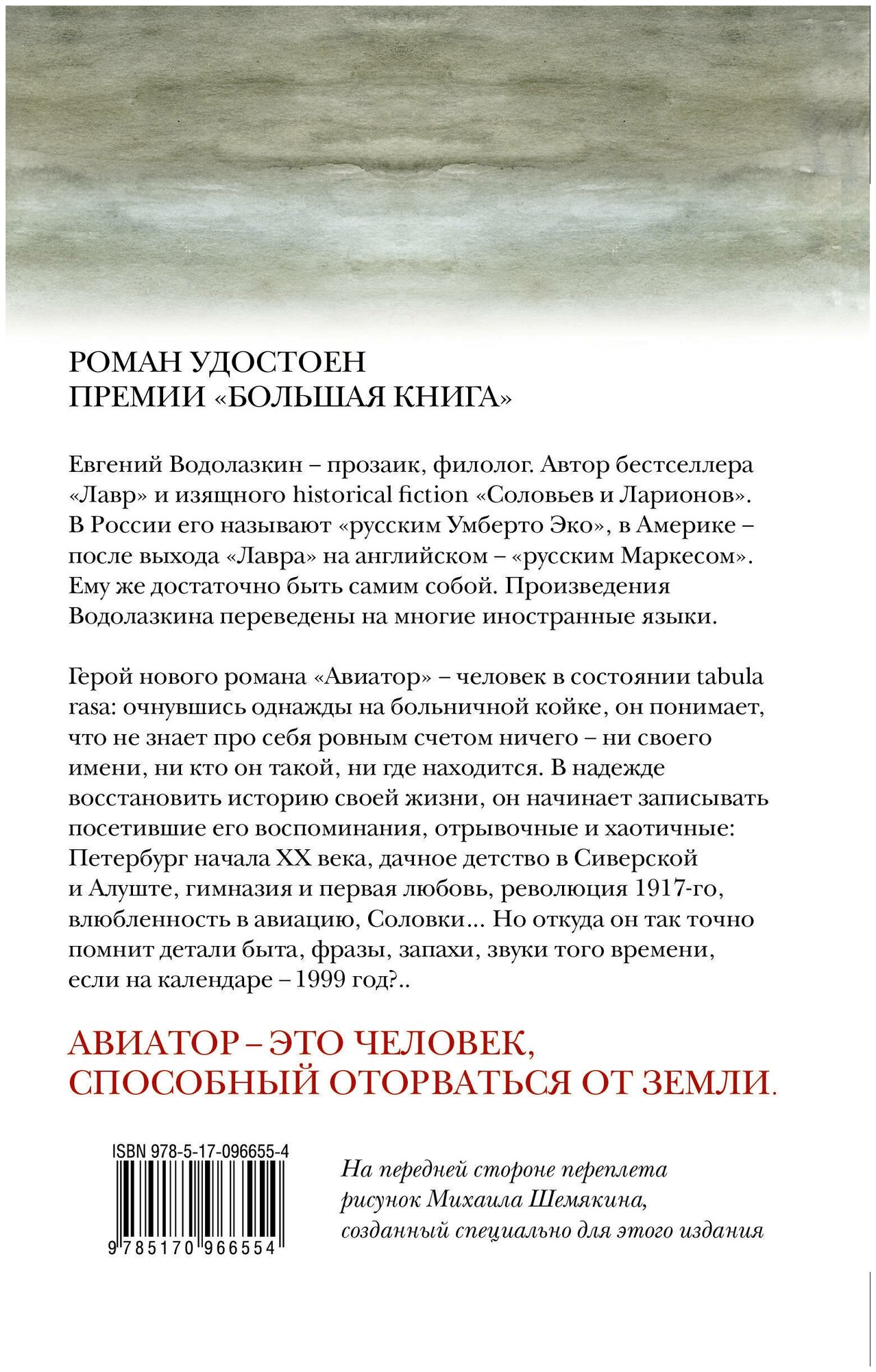 Герой романа "Авиатор" - человек в состоянии tabula rasa: очнувшись однажды на больничной койке, он понимает, что не знает про себя ровным счётом ничего - ни своего имени, ни кто он такой, ни где находится. В надежде восстановить историю своей жизни, он начинает записывать посетившие его воспоминания, отрывочные и хаотичные: Петербург начала ХХ века, дачное детство в Сиверской и Алуште, гимназия и первая любовь, революция 1917-го, влюбленность в авиацию, Соловки… Но откуда он так точно помнит детали быта, фразы, запахи, звуки того времени, если на календаре - 1999 год?..
