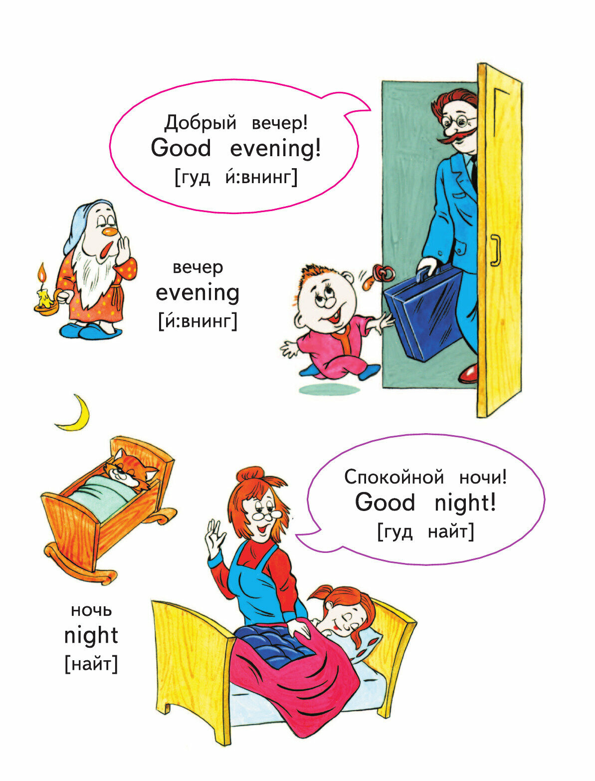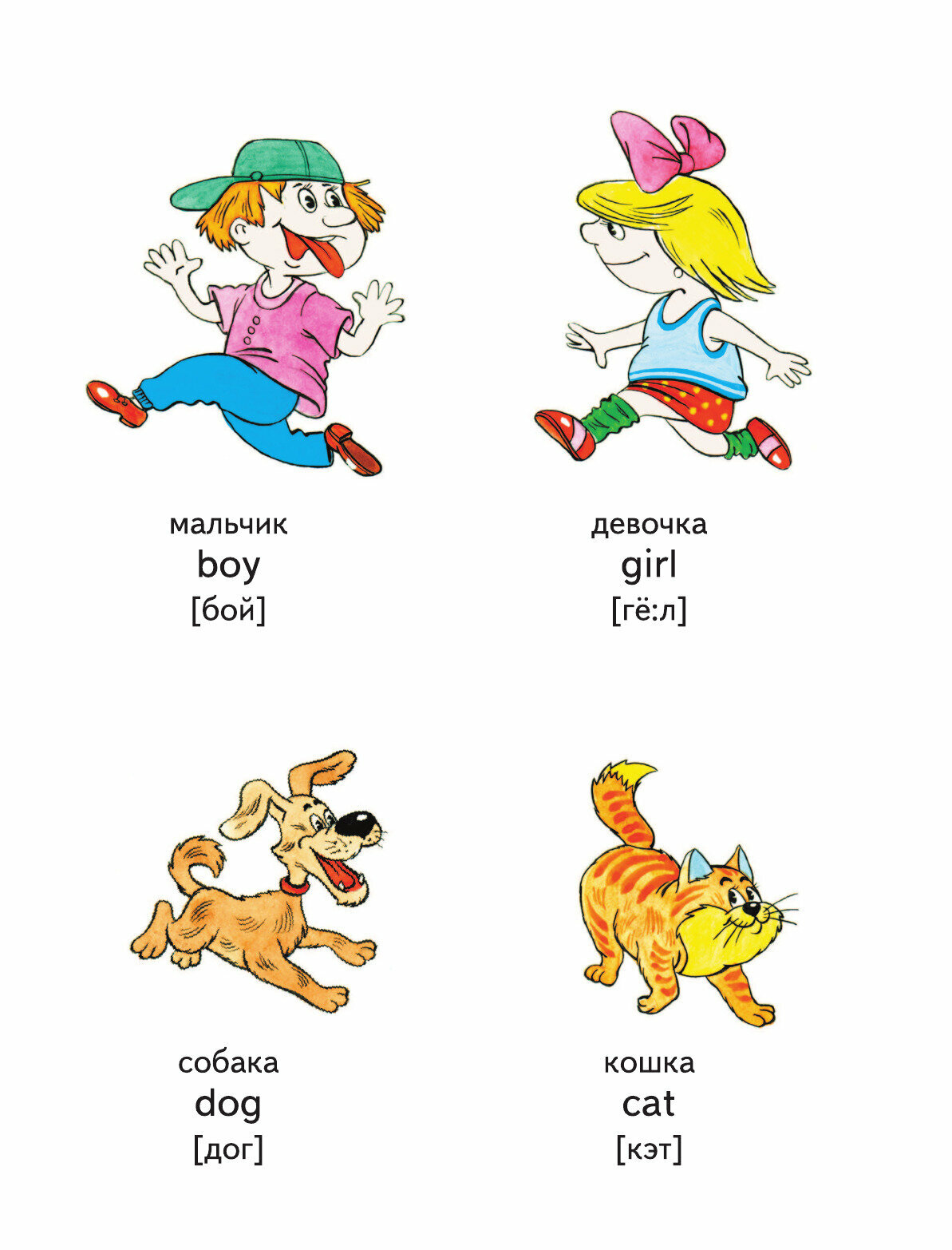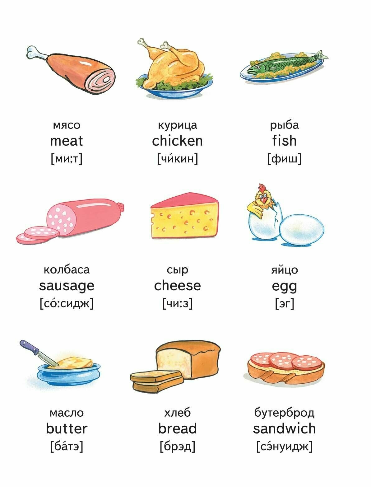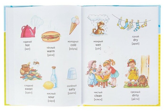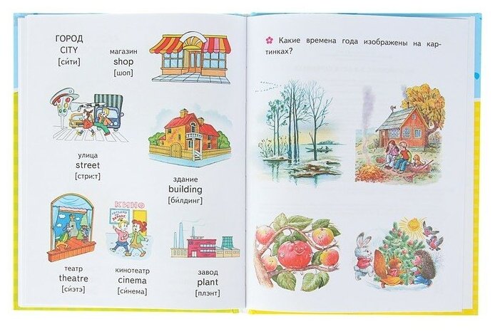 Это первая наша книга по изучению английского языка. В ней много небольших картинок и подписи к ним. Сначала слово или фраза по-русски, ниже по-английски, третьей строкой идет транскрипция английского слова, но написано по-русски. Именно это для меня стало решающим фактором при выборе первой книги.