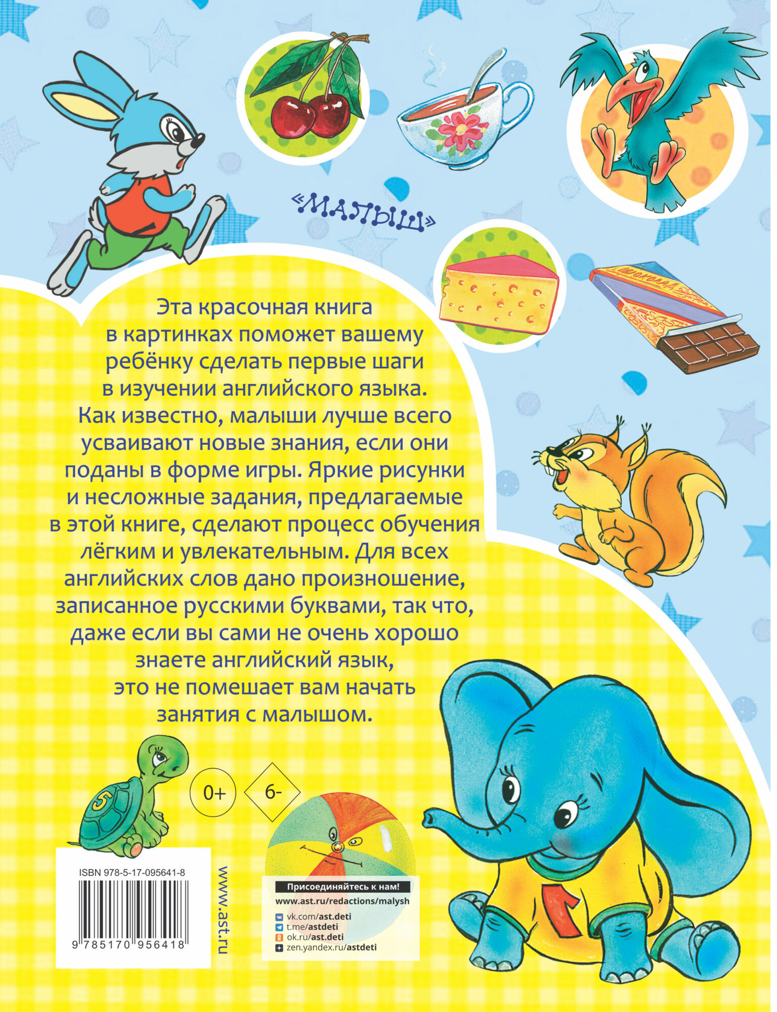 Эта красочная книга в картинках поможет вашему ребёнку сделать первые шаги в изучении английского языка. Как известно, малыши лучше всего усваивают новые знания, если они поданы в форме игры. Яркие рисунки и несложные задания, предлагаемые в этой книге, сделают процесс обучения лёгким и увлекательным. Для всех английских слов дано произношение, записанное русскими буквами, так что, даже если вы сами не очень хорошо знаете английский язык, это не помешает вам начать занятия с малышом.