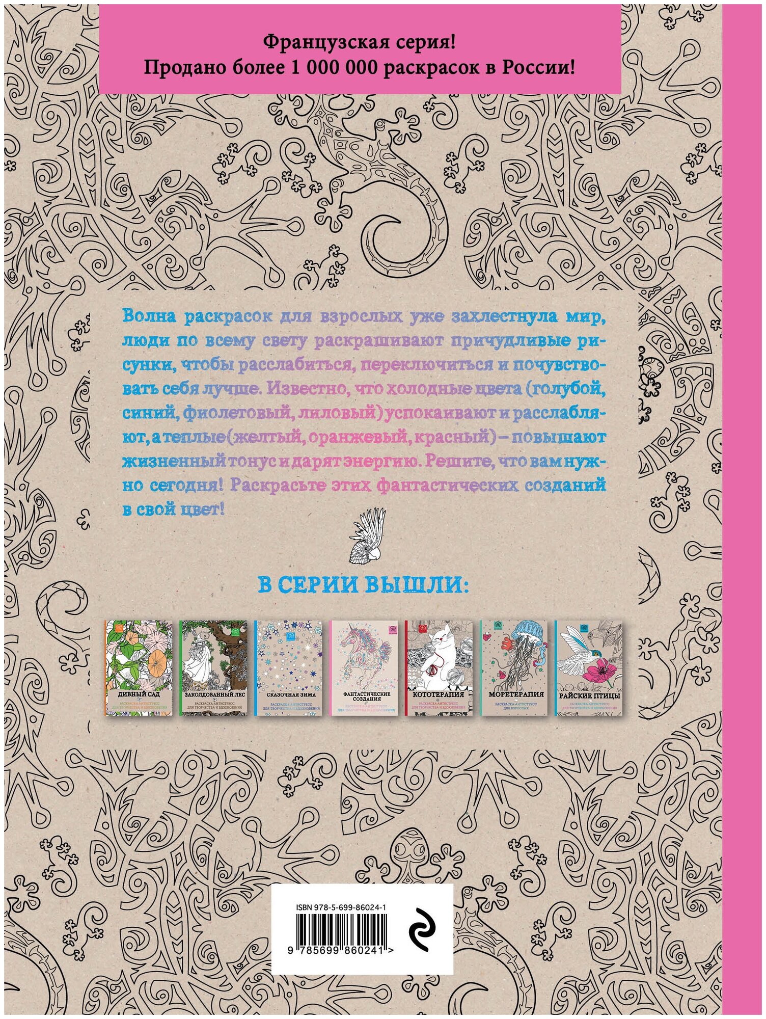 Расслабьтесь после тяжелого дня с раскрасками из серии «Арт-терапия». Возьмите цветные карандаши, выберите понравившуюся картинку и полностью отключитесь от реальности. Плавные линии и причудливые узоры унесут вас в другой мир, позволят полностью снять стресс и вернуться уже совершенно другим, обновленным и безмятежным, человеком. "Фантастические создания" - это множество удивительных мифических и вполне земных животных, которым вы можете придать невероятный окрас и особую индивидуальность. Придумайте свой мир, в котором поселятся эти восхитительные существа!
