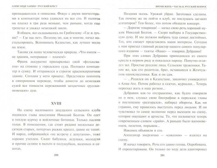 С первой страницы первого романа серии А.Лапина «Русский крест» я поняла – это целиком и полностью мой писатель! Давно не читала столь ярких, самобытных, захватывающих и мудрых книг! Начиная с «Утерянного рая», и заканчивая романом «Время жить!», каждая книга серии представляет собой отдельное, законченное произведение, но вместе с тем, если взглянуть на всю эпопею целиком, получается, что романы связаны одной сюжетной нитью и дополняют друг друга, образуя масштабное полотно, в которое уместилась более чем полувековая история России. И на протяжении всех шести книг мы наблюдаем за судьбой и взрослением (сначала физическим, а затем и духовным) главных героев, которые, в некоторой степени, представляют собой воплощение целого поколения русских людей, перешагнувших из одного тысячелетие в другое. Лапин – мой писатель еще и потому, что я по образованию психолог, а все его книги очень психологичны, и глубоки в плане понимания первопричин человеческих желаний и поступков. Каждый герой – это превосходно отрисованный отдельный психологический типаж, и все его поведение, все поступки обусловлены отнюдь не спонтанной волей автора, а закономерными особенностями характера героя, объективными причинами - то есть так, как и происходит в реальной жизни. А такое в художественных произведениях - большая редкость! Одним словом, от чтения я получила массу положительных эмоций и пользы. Надеюсь, роман будет еще не раз переиздан – и его смогут прочесть как можно большее число читателей.