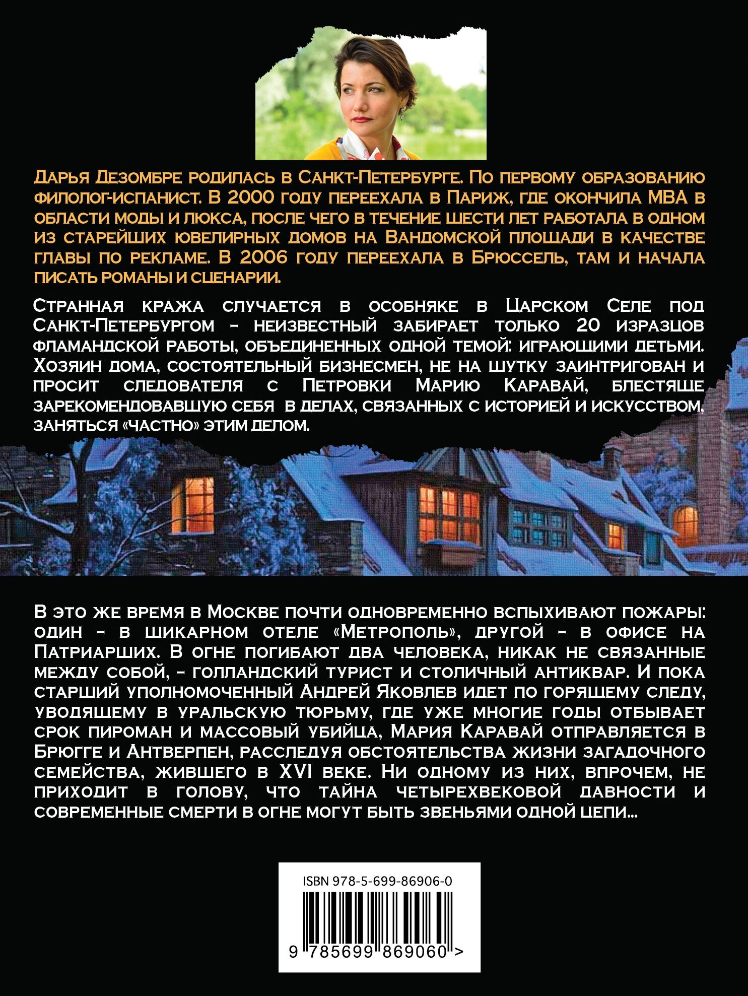 Странная кража случается в особняке в Царском Селе под Санкт-Петербургом - неизвестный забирает только 20 изразцов фламандской работы, объединенных одной темой: играющими детьми. Хозяин дома, состоятельный бизнесмен не на шутку заинтригован, и просит следователя с Петровки Марию Каравай, блестяще зарекомендовавшую себя в делах, связанных с историей и искусством, заняться "частно" этим делом. В это же время, в Москве почти одновременно вспыхивают пожары: один - в шикарном отеле "Метрополь", другой - в офисе на Патриарших. В огне погибают два человека, никак не связанные между собой - голландский турист и столичный антиквар. И пока старший уполномоченный Андрей Яковлев идет по горящему следу, уводящему в уральскую тюрьму, где уже многие годы отбывает срок пироман и массовый убийца, Мария Каравай, отправляется в Брюгге и Антверпен, расследуя обстоятельства жизни загадочного семейства, жившего в XVI веке. Ни одному из них, впрочем, не приходит в голову, что тайна четырехвековой давности и современные смерти в огне могут быть звеньями одной цепи…