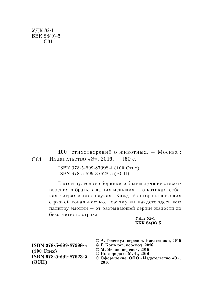 100 стихотворений о животных (Пушкин А.С., Блок А.А., Ахматова А.А. И Др.); Эксмо, Редакция 1, 2016
