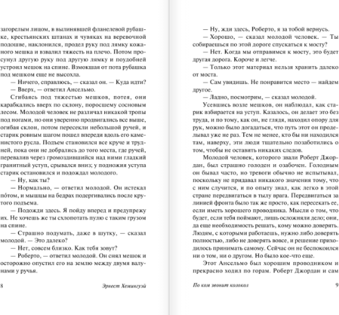 "По ком звонит колокол" - роман о военном времени. Эта книга охватывает всего пять дней из жизни одного человека, который должен любой ценой выполнить приказ. Я умышленно не хочу называть имен, ведь он один из десятков тысяч таких же. Его цель - взорвать мост на вражеской территории строго в определённое время. За помощью он обращается к партизанскому отряду, в котором знакомится с девушкой, спасённой из фашистского плена.