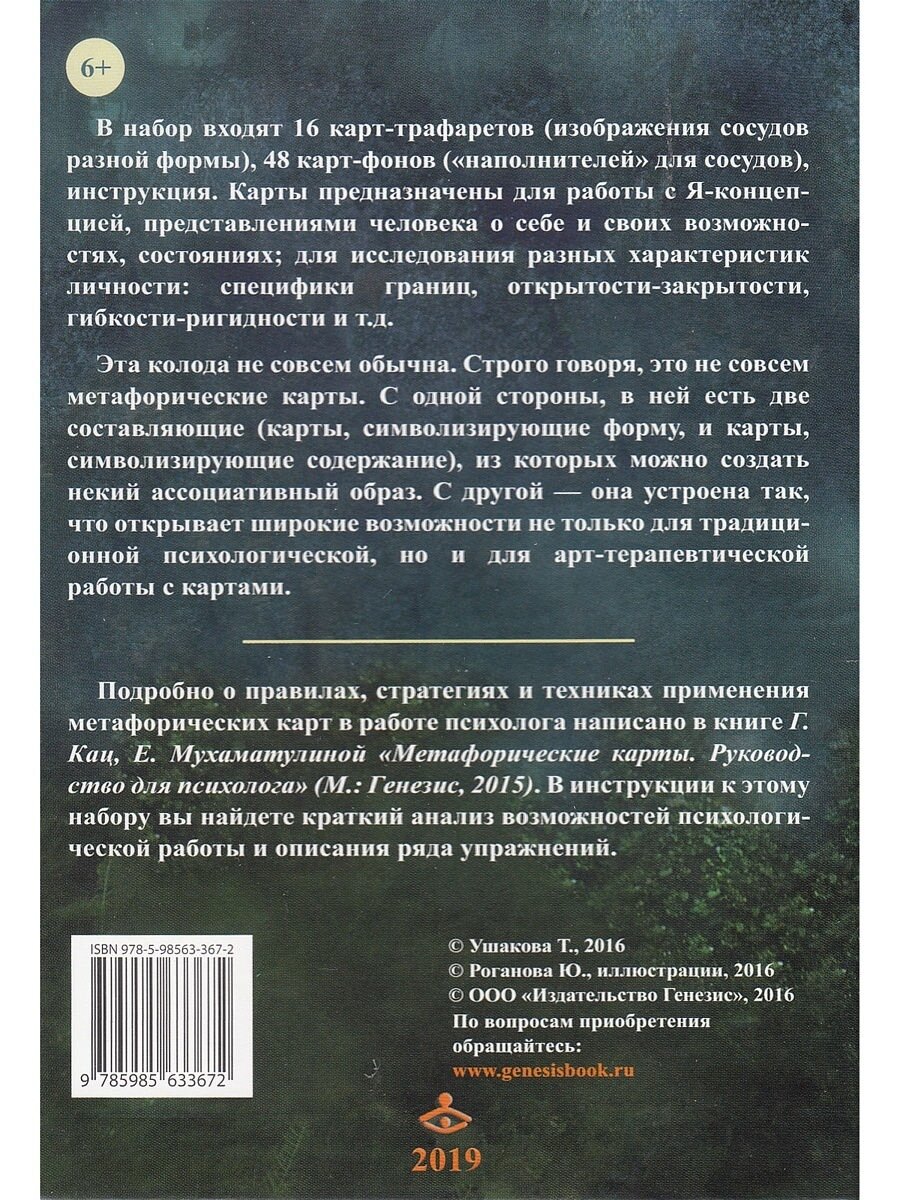 В набор входят 16 карт-трафаретов (изображения сосудов разной формы), 48 карт-фонов ("наполнителей" для сосудов), инструкция. Карты предназначены для работы с Я-концепцией, представлениями человека о себе и своих возможностях, состояниях; для исследования разных характеристик личности: специфики границ, открытости-закрытости, гибкости-ригидности и т.д. Эта колода не совсем обычна. Строго говоря, это не совсем метафорические карты. С одной стороны, в ней есть две составляющие (карты, символизирующие форму, и карты, символизирующие содержание), из которых можно создать некий ассоциативный образ. С другой — она устроена так, что открывает широкие возможности не только для традиционной психологической, но и для арт-терапевтической работы с картами.