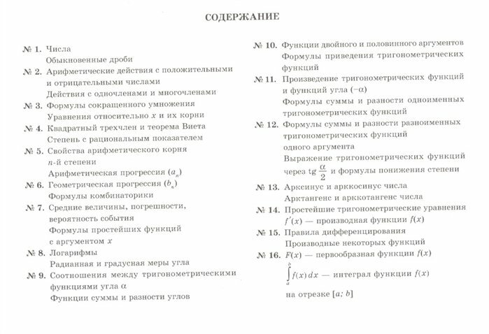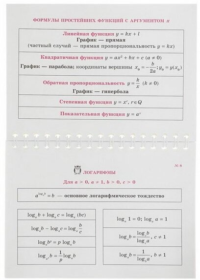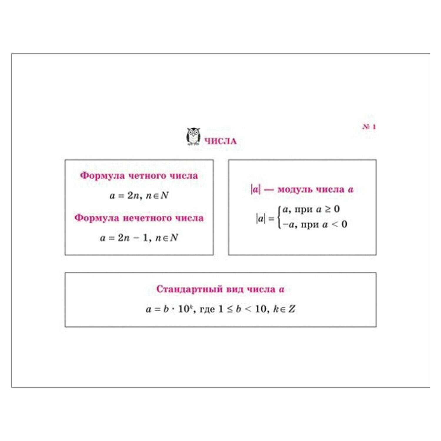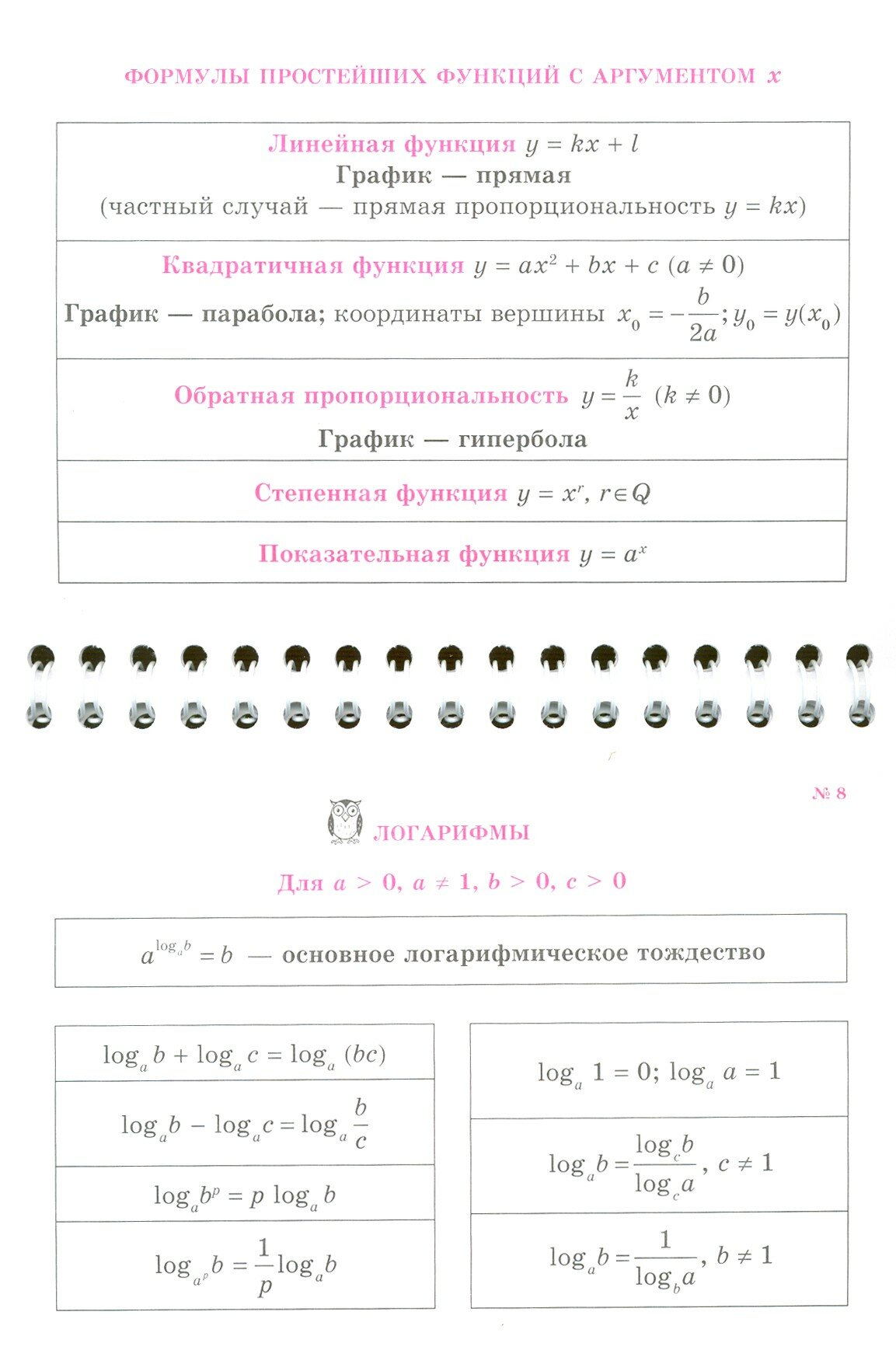 Великолепный справочник для тех, кто знает математику, но хочет держать формулы и способы решений в руках. В тексте ничего лишнего, формулы помещены в рамку, названия тем выделены другим цветом, что помогает быстро найти информацию, а это несомненный плюс любой справочной литературы.Справочник напечатан на плотной бумаге, что немаловажно при его длительном использовании. Крепление на спирали тоже добавляет удобств при пользовании этим чудесным справочным пособием. Единственное замечание: хотелось бы в одном издании иметь и сведения по геометрии, такие же краткие и чёткие, с чертежами. Пользуюсь с удовольствием.