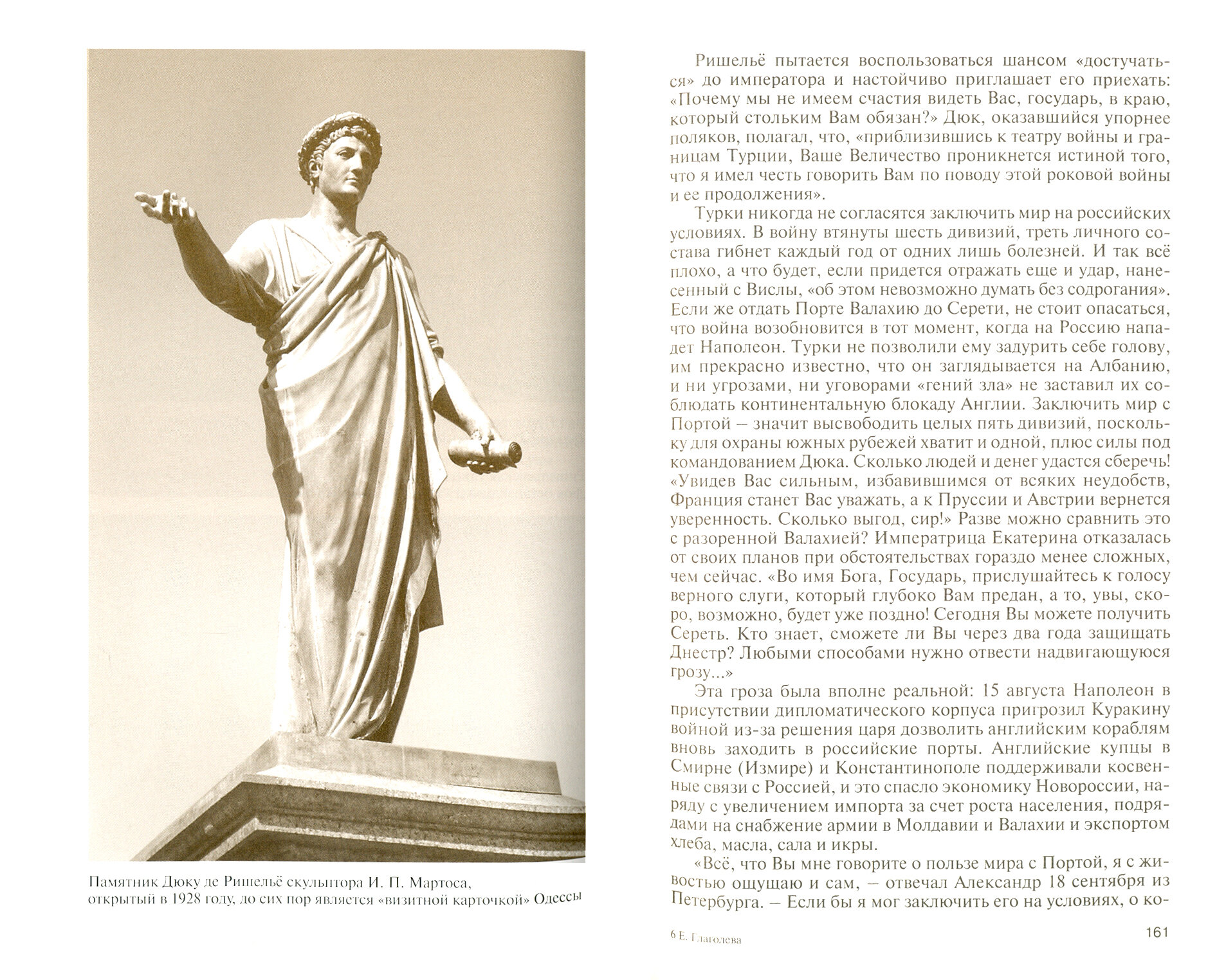 Арман Эммануэль дю Плесси, 5-й герцог де Ришельё (1766?1822), получил в России имя Эммануил Осипович и был запечатлен в бронзе как Дюк. Прапраправнучатый племянник знаменитого кардинала и внук маршала вынужден был покинуть родину во время революционных потрясений, добровольцем участвовал в кровопролитном штурме турецкой крепости Измаил, 24 года верно служил "приемному отечеству" - России, на посту генерал-губернатора боролся с косностью, невежеством и мздоимством, чтобы на месте захудалого поселка вырос цветущий город Одесса. Возвратившись в разоренную Францию, он в качестве главы правительства вел изматывающие кабинетные сражения за независимость и благосостояние страны, но не превратился в царедворца и остался "чужим среди своих". Его безграничная способность любить была вынуждена ютиться на краешке мечты о личном счастье. Российский император Александр I назвал Дюка единственным другом, говорившим ему истину, а английский герцог Веллингтон считал, что "слово Ришельё стоит трактата". Он с честью носил родовое имя и занял достойное место в истории Франции, России и Украины.