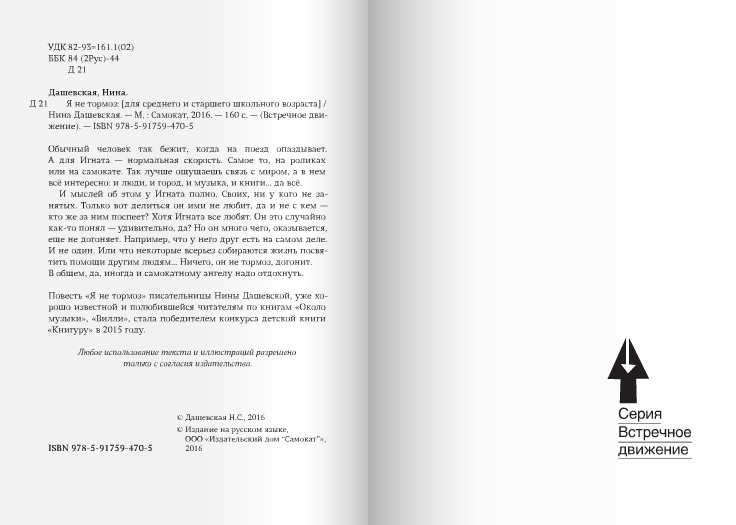 Повесть "Я не тормоз" писательницы Нины Дашевской, уже хорошо известной и полюбившейся читателям по книгам "Около музыки", "Вилли", стала победителем конкурса детской книги "Книгуру" в 2015 году.