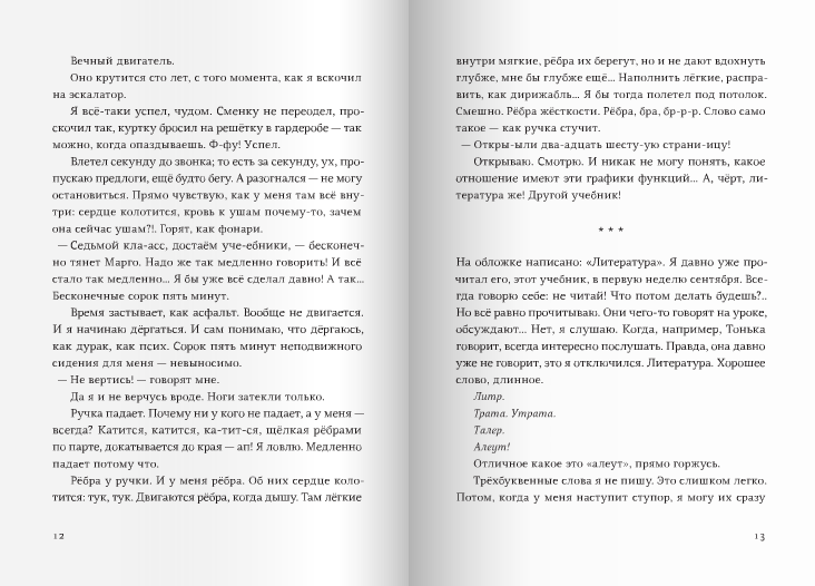 Несется, летит на своем самокате 13-летний Игнат и в его голове несутся и летят мысли, резво сменяя одна другую, цепляясь друг за друга, рифмуясь, подгоняя. "У человека голова, а в ней болтаются слова..." Несется, летит повествование в этой книге, даря свет, улыбку, эмоции, знание… Внутренний мир подростка в словах, буквах, запятых и многоточиях. Вот он смотрит на этот мир широко открытыми глазами и сердцем, такой живой мальчишка. Любит, творит, видит этот мир иначе и думает, что он один такой и что он один из многих, вдруг узнает что-то новое и в один миг растет. Пишет не стихи (или стихи?)), честно, я поклонник прозы, но тут меня проняло: