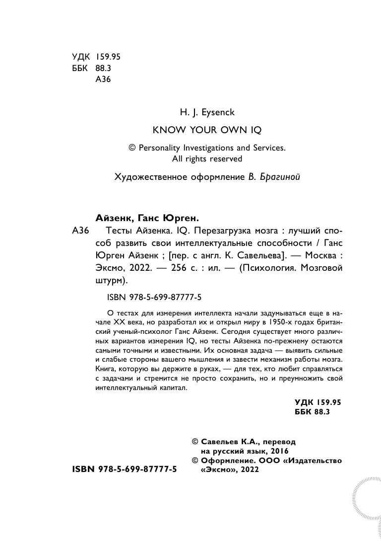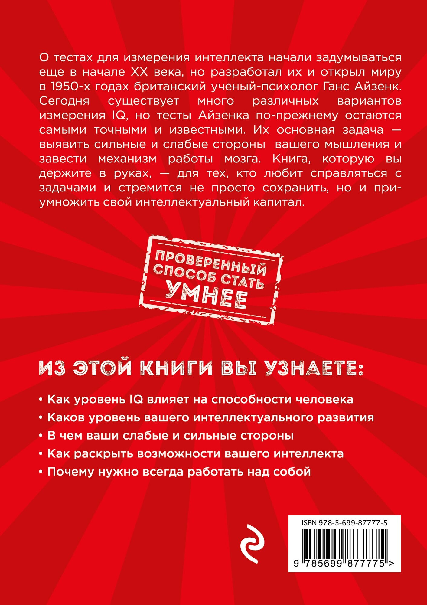 О тестах для измерения интеллекта начали задумываться еще в начале XX века, но разработал их и открыл миру в 1950-х годах британский ученый-психолог Ганс Айзенк. Сегодня существует много различных вариантов измерения IQ, но тесты Айзенка по-прежнему остаются самыми точными и известными. Их основная задача - выявить сильные и слабые вашего мышления и завести механизм работы мозга. Книга, которую вы держите в руках, - для тех, кто любит справлять с задачами и стремится не просто сохранить, но и преумножить свой интеллектуальный капитал.