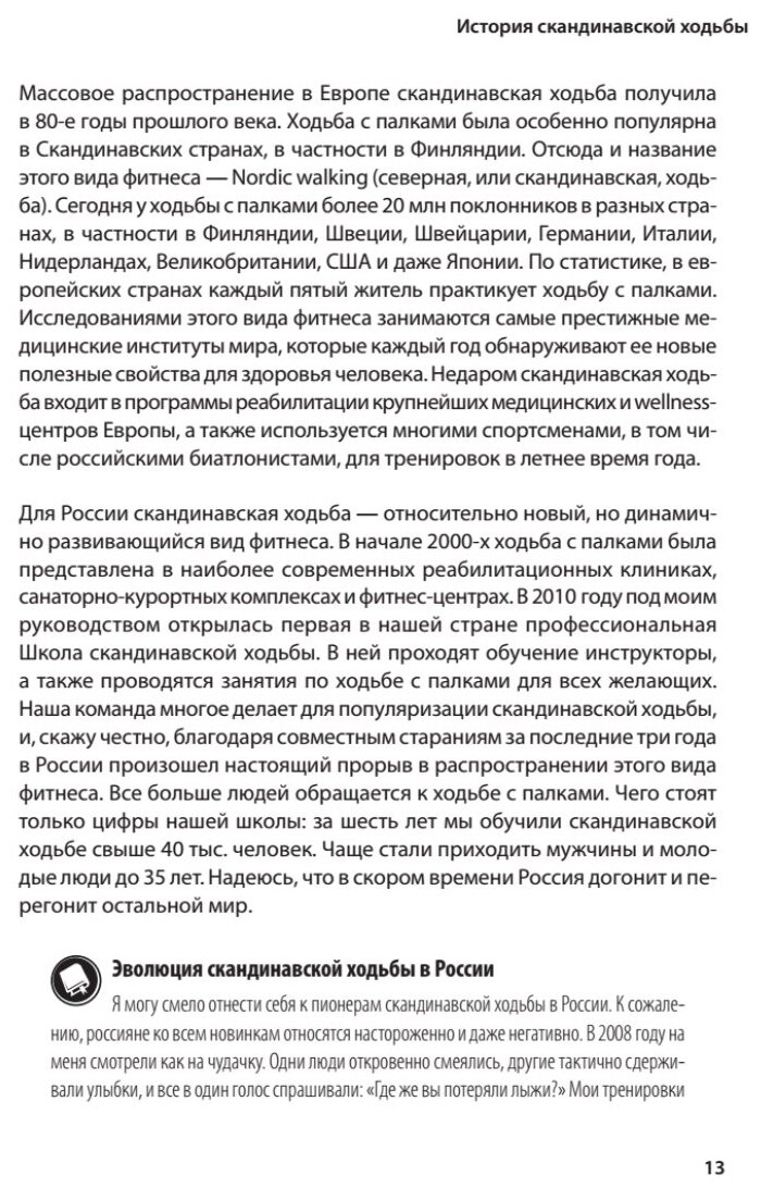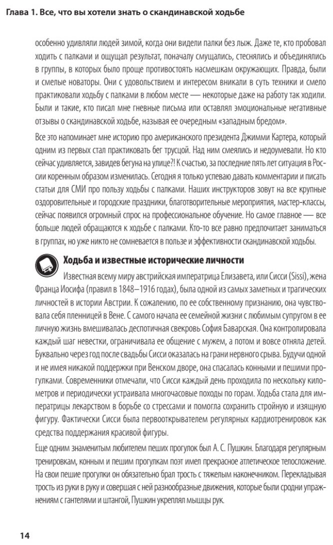 Мне понравилосьСкандинавской ходьбой регулярно занимаюсь уже 5 месяцев. Книгу Поляковой прочитала, чтобы больше узнать о ходьбе. Книга написана простым языком, указаны основные технические моменты, в том числе методика достижения аэробного режима, что мне было особо актуально. Книга полезна и отвечает на многие вопросы по занятиям скандинавской ходьбой. Книгу можно рекомендовать широкому кругу читателей любой возрастной группы.