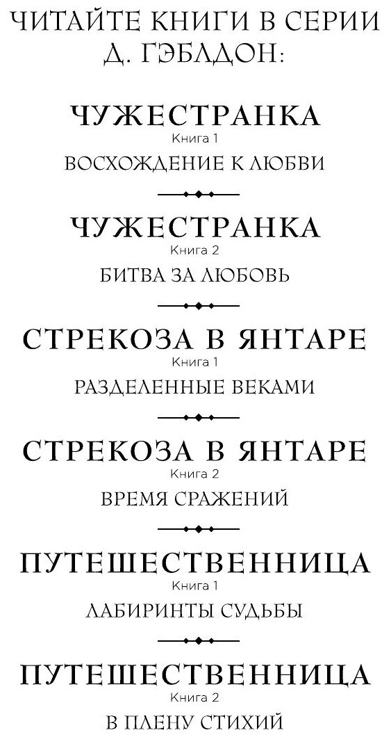 Сага о великой любви Клэр Рэндолл и Джейми Фрэзера - любви, которой не страшны пространство и время, завоевала сердца миллионов читателей во всем мире. Двадцать лет Клэр Рэндолл хранила свою тайну и надеялась, что однажды найдет способ вновь оказаться рядом с Джейми, человеком, которого все долгие годы разлуки продолжала любить. Но, воссоединившись, возлюбленным вновь предстоит пройти нелегкие испытания. Смогут ли Клэр и Джейми преодолеть все невзгоды и сохранить свое хрупкое счастье?