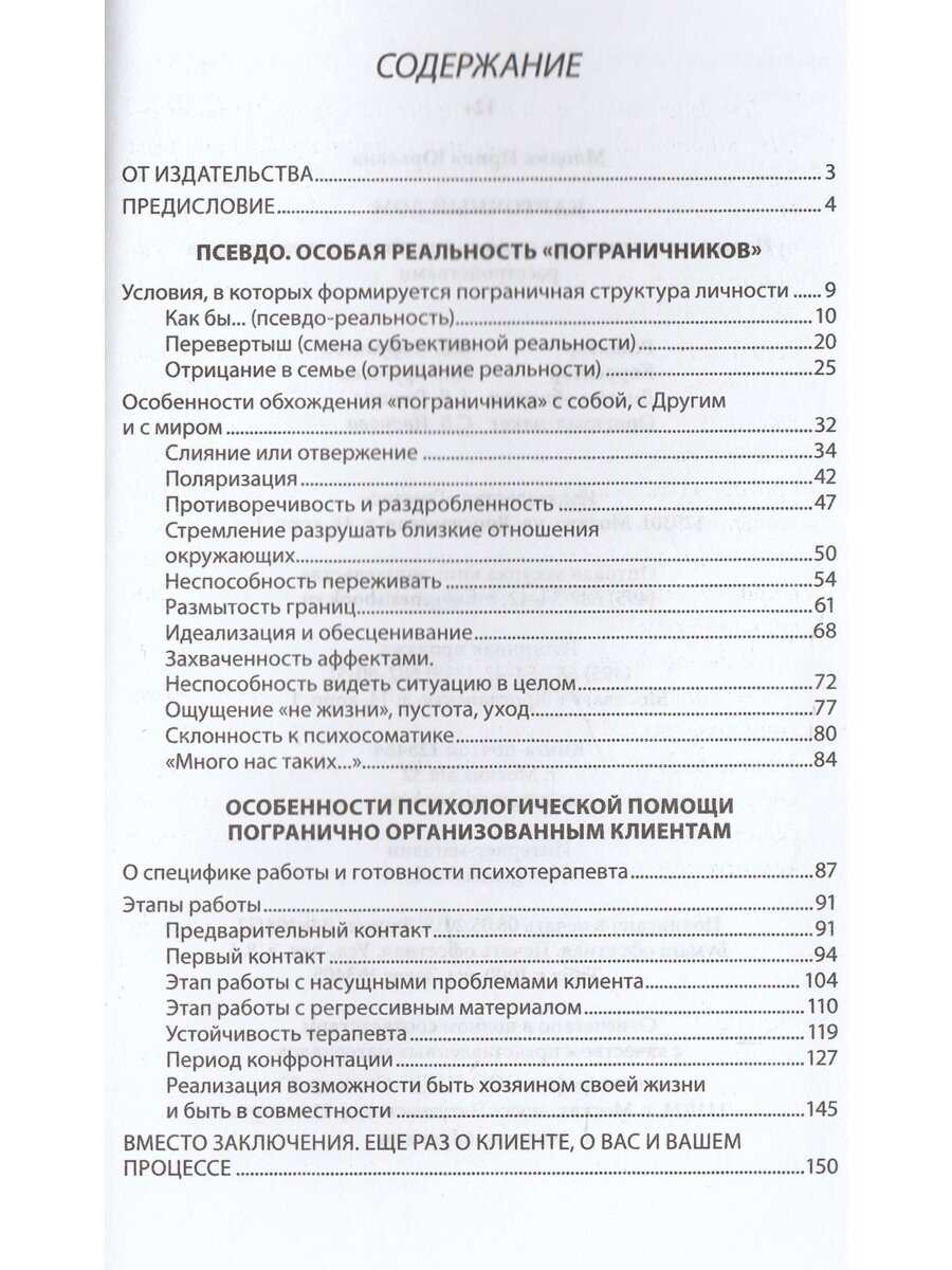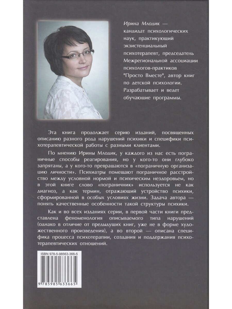 .По мнению автора, у каждого из нас есть пограничные способы реагирования, но у кого-то они глубоко запрятаны, а для кого-то стрессом является жизнь как таковая, и потому эти способы превращаются в "пограничную организацию личности". Психиатры и психоаналитики помещают "пограничников" между невротиками (условно психически здоровыми людьми) и психотиками (психически нездоровыми). Задача автора - понять качественные особенности структуры психики таких людей. Как и во всех изданиях этой серии, первая часть книги посвящена феноменологии: анализу условий, в которых формируются такие особенности психики, способов обхождения "пограничника" с собой, с окружающими, с миром (правда, в отличие от предыдущих книг серии, уже не в форме художественного произведения). Во второй части описаны особенности психотерапевтической помощи таким клиентам. Книга адресована не только психотерапевтам, но и широкому кругу читателей.